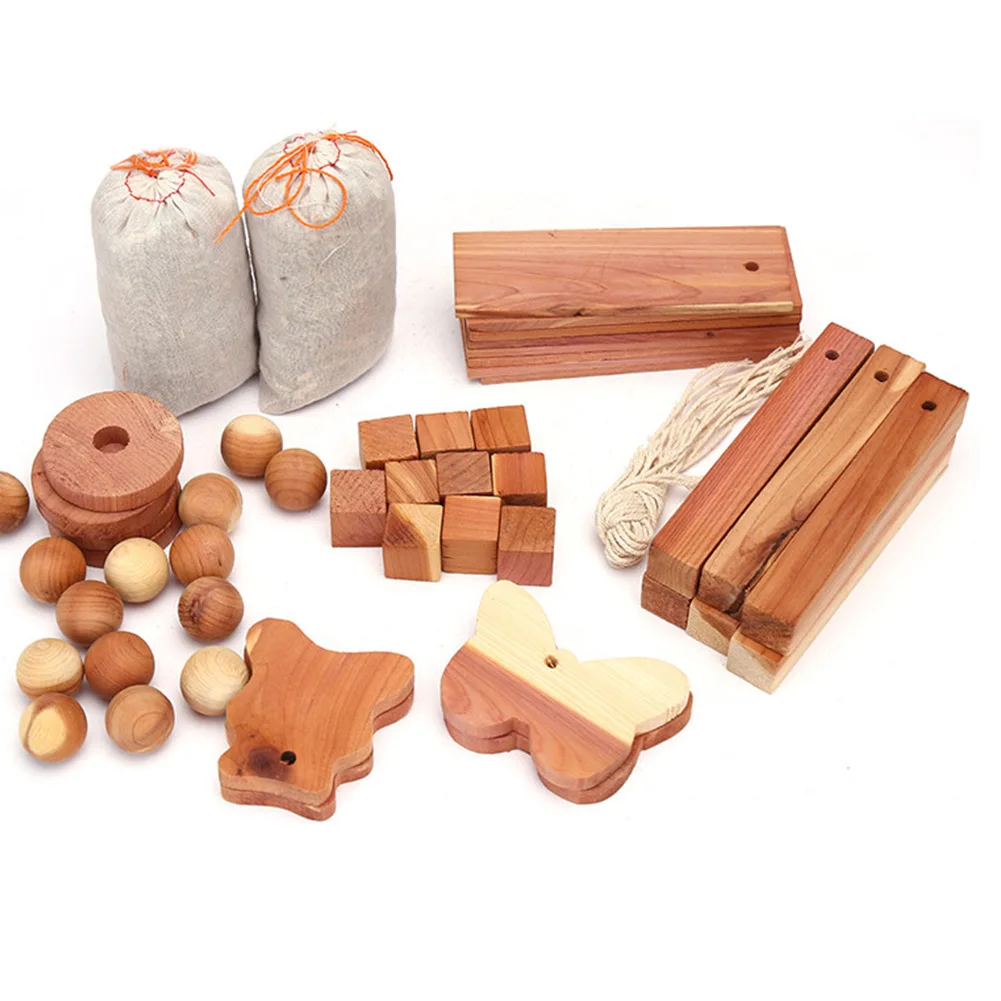 Полный набор, который включает различные репеллент моли, такие как саше, шарики от моли, деревянная доска, деревянные блоки.