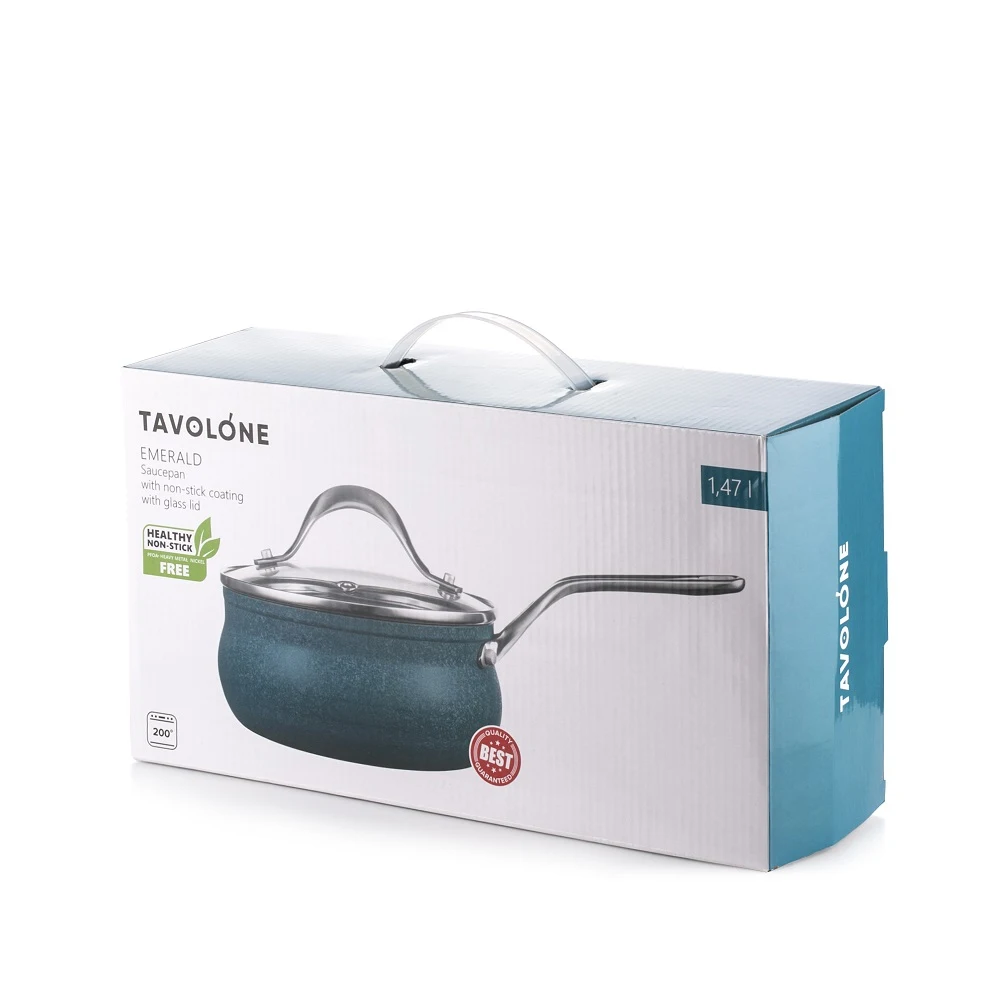 Ковш TAVOLONE серии Emerald изготовлен из высококачественных материалов, безопасен и в использовании, имеет длительный срок службы. Прочное антипригарное покрытие на основе структуры гранита. Покрытие не содержит PFOA, кадмий, свинец и полностью безопасно. Корпус из алюминия, нагревается легко и не деформируется. Можно использовать неострые металлические инструменты. Подходит для всех типов плит, включая индукционные. Ненагревающиеся ручки с покрытием Soft-touch предотвращающим выскальзывание.