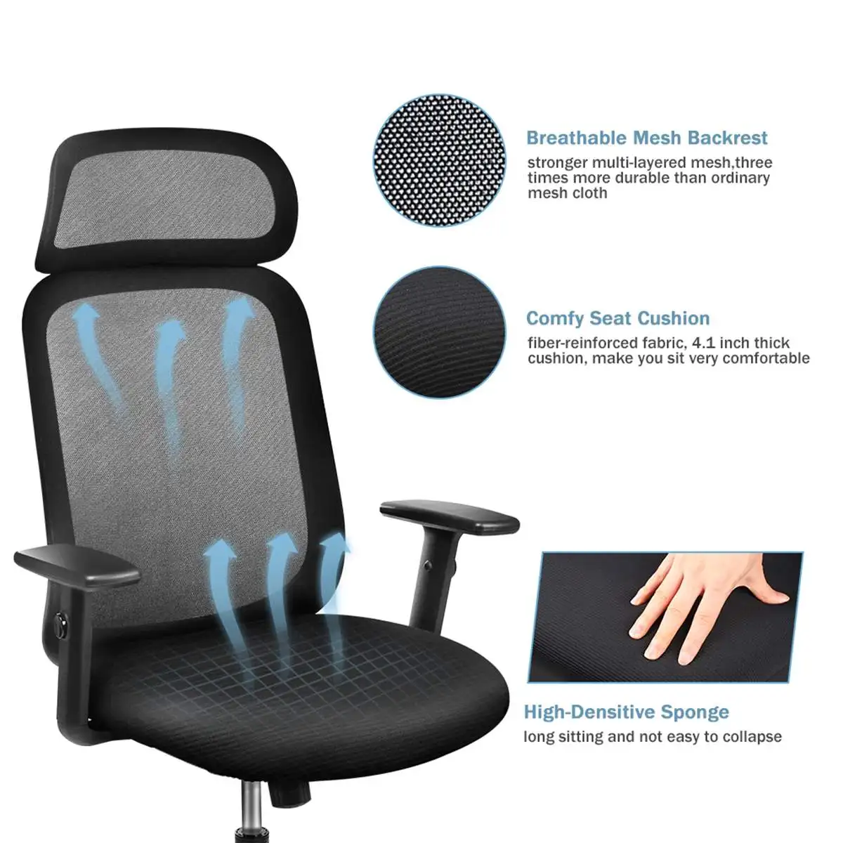 Эргономичный сетчатый офисный стул с высокой спинкой, письменный стул с регулируемыми подлокотниками из искусственной кожи, компьютерный стул с большим подголовником, спинка наклоняется, толстое сидение, регулировка высоты-черный (панда)