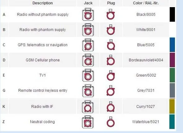 Разъемы FAKRA используются для автомобильных радиочастотных решений и обеспечивают несколько цветов и ключевые коды для удобства окончательной сборки коаксиальных соединений FAKRA используются на устройствах с внешними антеннами; Такие приложения включают SDARS, Cellular, gps-навигация, безключевое вход и спутниковое радио. Разъем FAKRA обеспечивает функцию механического ключа вместе с визуальным цветовым кодом для различия между приложениями. Разъемы FAKRA С высокотемпературным пластиковым кожухом, полностью совместимым с процессом оплавления без свинца, предлагаются антенна с этим разъемом Fakra совместима с: VW RNS510 (MFD3);VW MFD2 (RNS2); Шкода Коламбус; MERCEDES COMMAND System W211 (E-CLASS);MERCEDES APS 50;AUDI RNS-E (DVD НАВИГАЦИЯ);AUDI MMI (A6 4F, A8 4E);