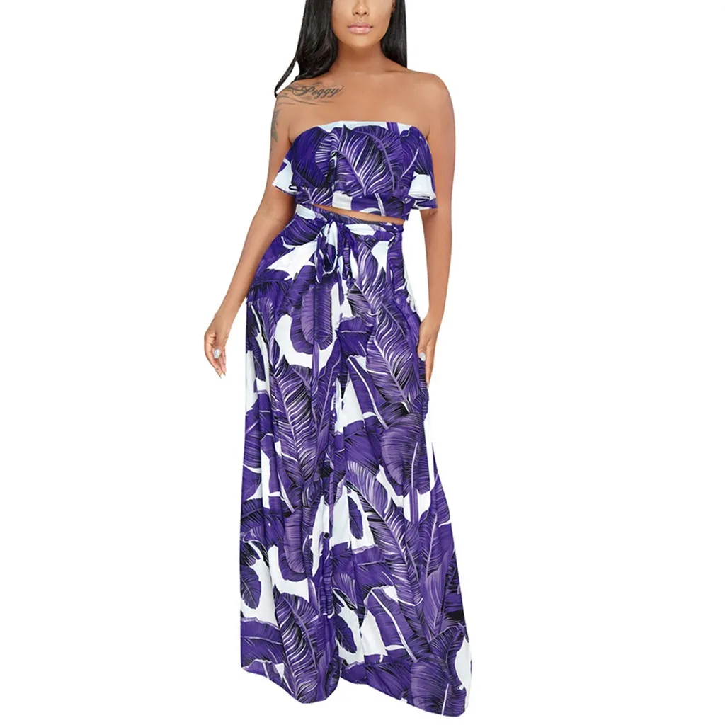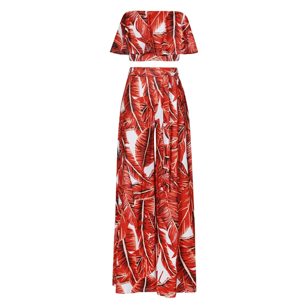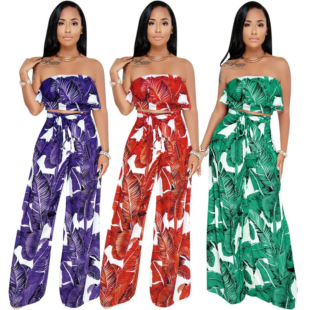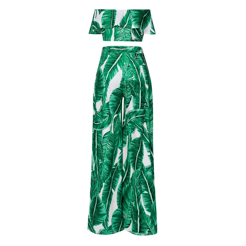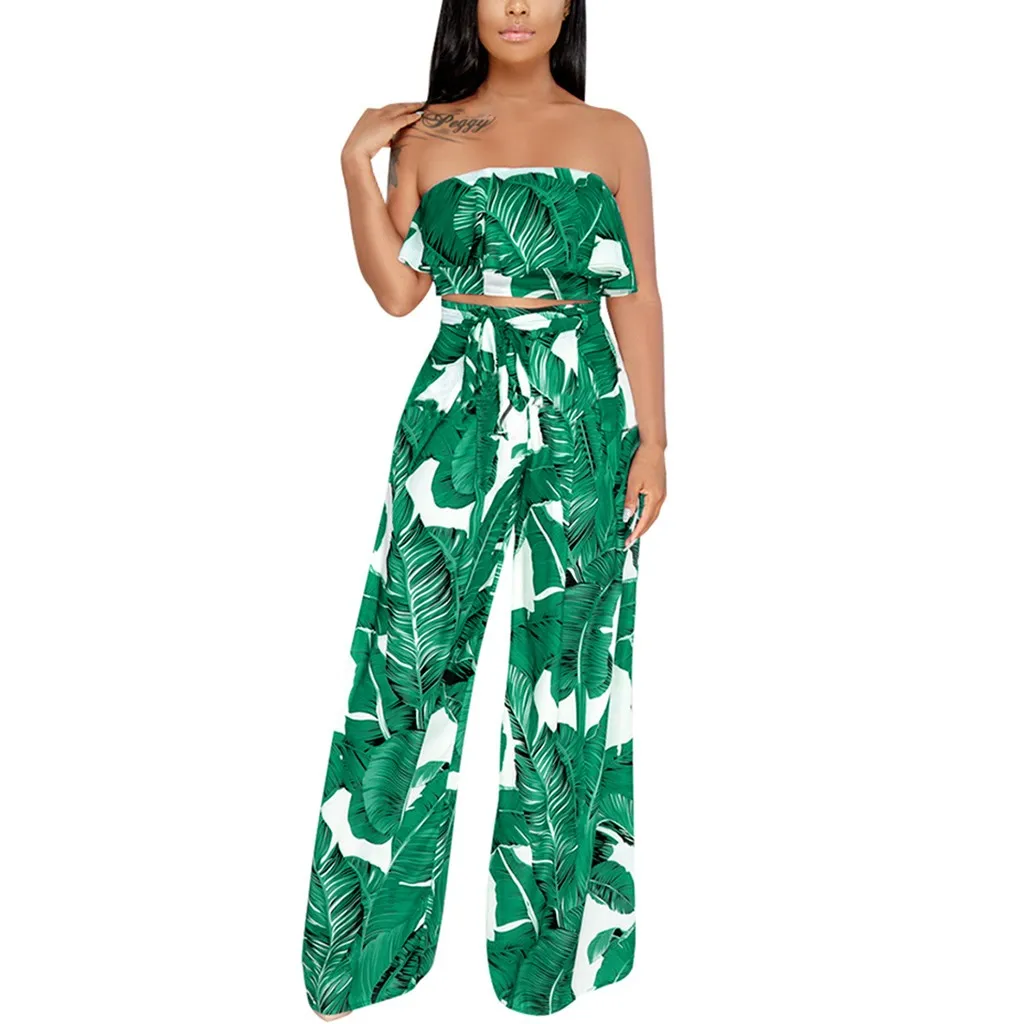 Women Sex Sleeveless Floral Ruffle Backless Tops+Loose Haren Wide Pants Set Suit