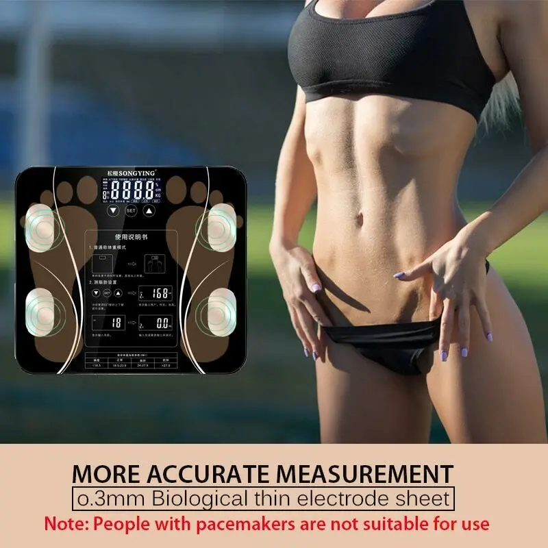 <15 Функции измерения состава тела: с биоэлектрической технологией анализа импеданса (BIA) цифровые весы не только показывают вес тела, но и показывают жир в теле, воду, мышечную массу, ИМТ и другие данные. Это помогает вам своевременно узнавать больше данных о вашем теле.