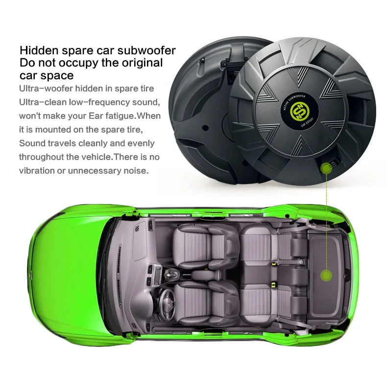 Скрытый в запасной шинах сабвуфер Скрытый мощный автомобильный сабвуфер запасная шина Sub - No Lost Space Автомобильный сабвуфер с питанием (встроенный усилитель). Sub легко помещается в запасную шину (поставляется поверх запасной шины, чтобы вы могли оставить свою запасную шину на месте). Скрытая в запасной шине-не занимает места в багажнике. Супер чистый звук, который является музыкальным и не утомит ваши уши. Когда он установлен в запасной шине, звук передает чисто и равномерно по всему транспортному средству без каких-либо вибраций или нежелательных шумов. Туннельный воздушный порт. Встроенный усилитель питания PWM MOSFET. Низкоуровневые входы RCA. 10-ти дюймовый высокое экскурсия сабвуфер. Конструкция обратного крепления. Установка подключи и играй с проводом, содержащим питание, землю, высокий уровень входного сигнала, дистанционное включение и RCA