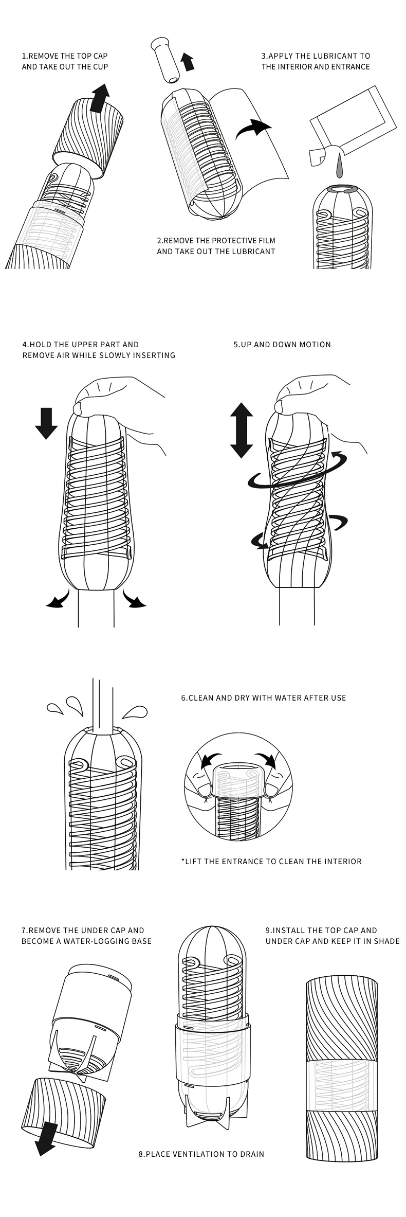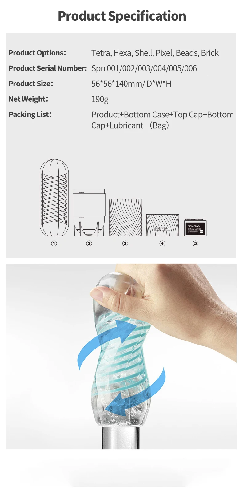 Он имеет уникальную пружинную роторную структуру, которая добавляет спираль и сосание, когда чашка мастурбации была перемещена и сжимается.