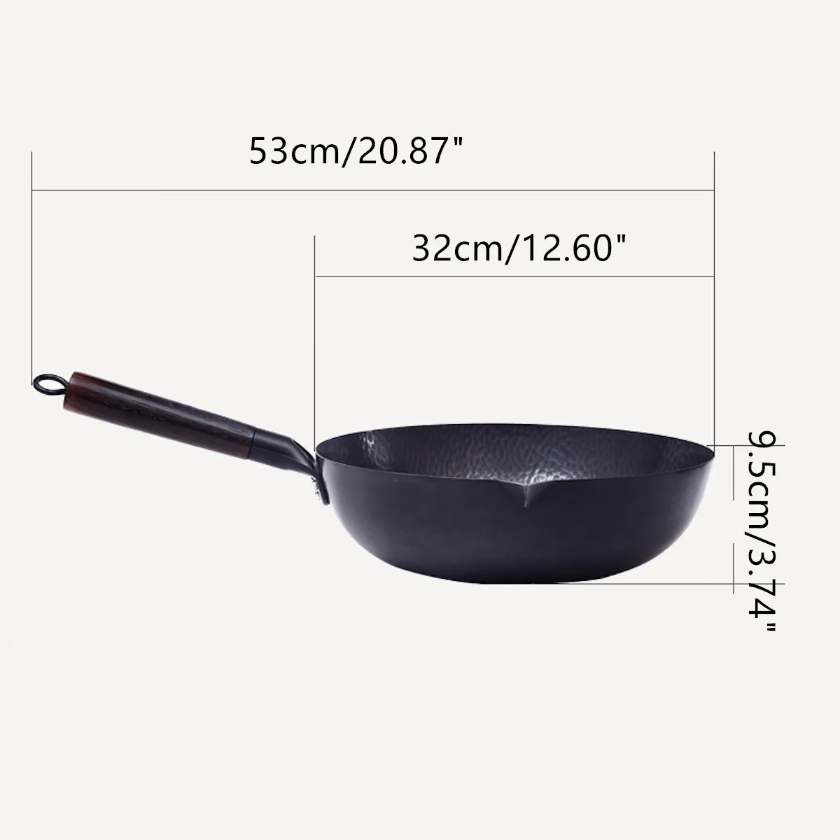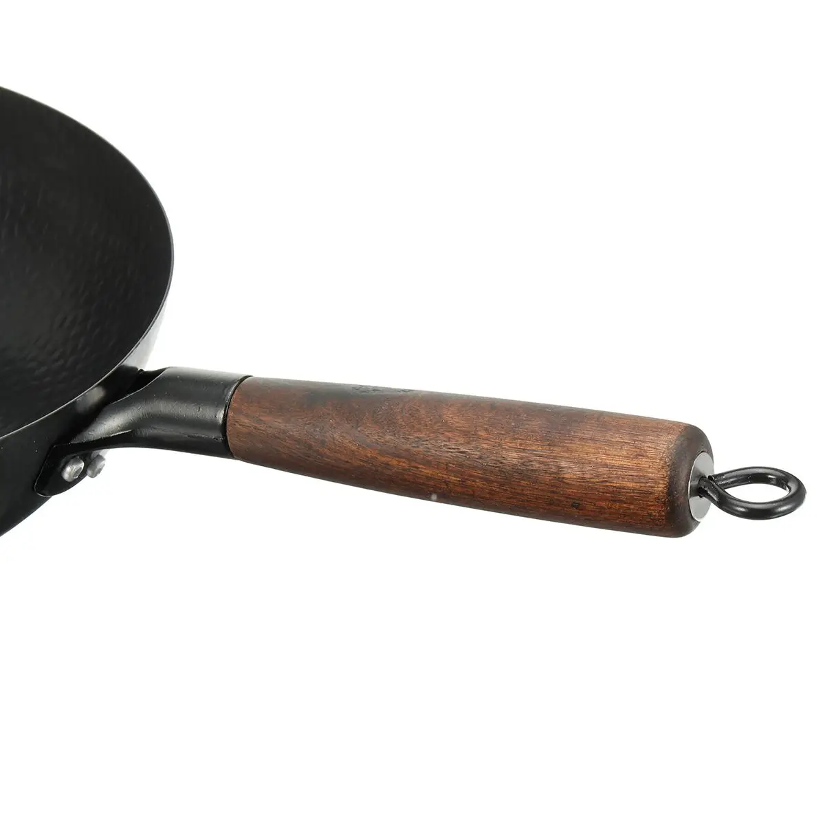 ● Изготовлен из кованого железа и деревянной ручки, хорошая теплопроводность, равномерно нагревает еду. Непокрытая, прочная, долговечная посуда.