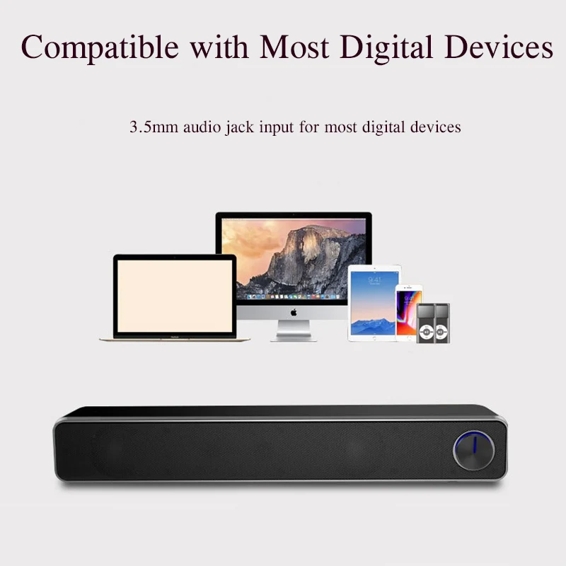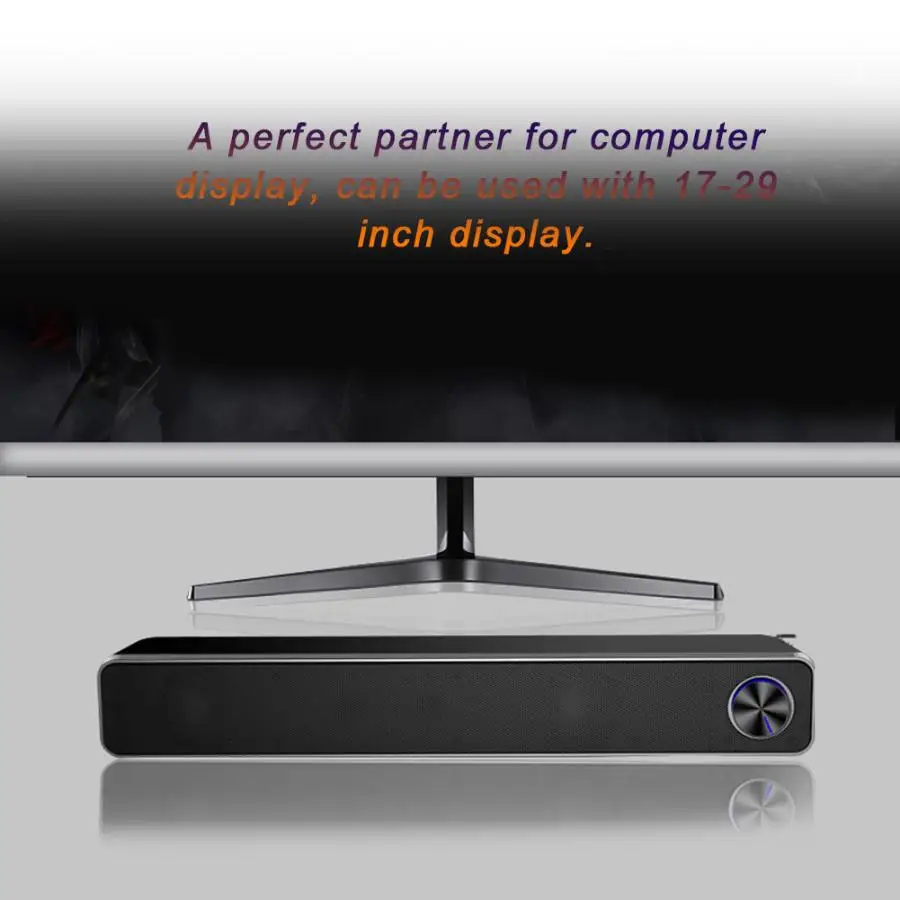 Concealed design, does not take up much space and double speaker provides more stereo sound. Large knob design, independently to adjust the volume, more convenient and practical to use. A perfect partner for computer display, can be used with 17-29 inch display. Double sound unit double bass hole to form a stereo field and experience stereo surround sound. The dual-speaker system gives you a 360-degree surround experience, and the sound quality is better. 3.5mm common audio jack, can be used as computer speaker, and compatible with 99% of smart devices on the market. 3D stereo surround sound, suitable for office, home and dormitory. The bass technology makes the low-frequency loudness enhanced and the music detail is delicately presented.