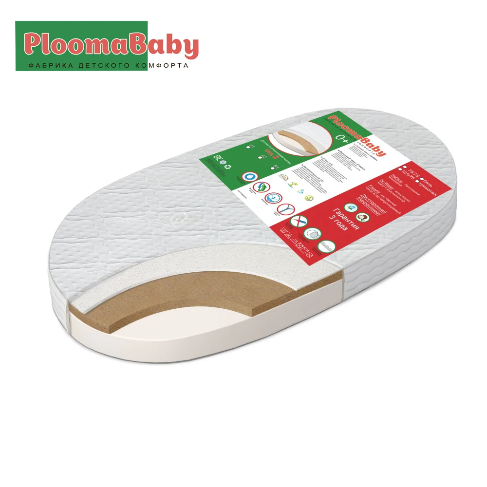 • Производство Россия. Торговая марка PLOOMABABY на рынке уже более 10 лет. И за это время зарекомендовала себя как качественный и надежный производитель матрасов Европейского качества. Продукция изготавливается на самом современном и высокотехнологичном оборудовании с соблюдением всех норм и соответствует стандартам ЕАС. Вся продукция имеет сертификацию и соответствует требованиям технического регламента Таможенного союза ТР ТС 025/2012 «О безопасности мебельной продукции».