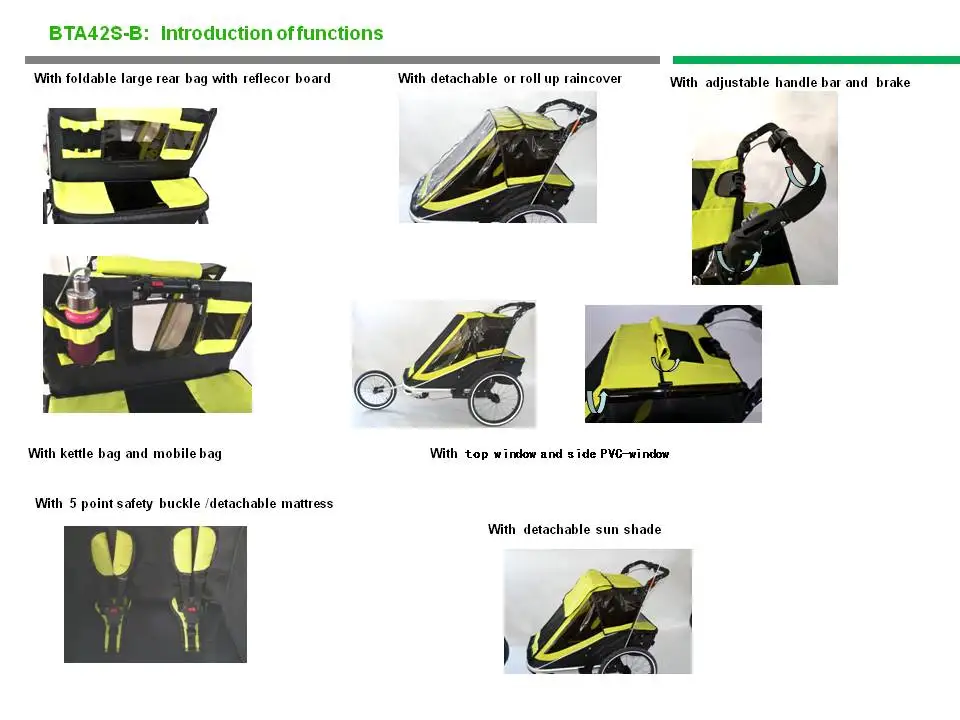 Размер прицепа: 156*83*100 см размер коляски: 108*83*100 см Материал: оксфорд из алюминиевого сплава Возьмите двойняшек с собой, чтобы покататься с двойным буксировочным колесом 3 в 1, отличный продукт 3 в 1 для активных родителей, этот трейлер удобно превращается в коляску, так что вы можете модернизировать свои утренние пробежки и прогулка в воскресенье. В комплекте имеется сцепная муфта, которую можно прикрепить к практически каждому велосипеду, эта детская переноска с откатным механизмом подходит для большинства видов велосипедов. Максимальный лимит веса-110 фунтов. Когда вы получите трейлер, требуется сборка. 20 дюймовые пневмотические шины обеспечивают коэффициент полезного действия, безопасность и стиль бесконечности. Два комплекта шлейки с пятью точками обеспечивают защиту ваших гонщиков как в режиме буксировки, так и в режиме коляски, призванной защитить ваших детей от элементов, 3-в-1 навес оснащен как ошибки экран и неблагоприятным погодным условиям и щит с сзади Вентиляционное окно BTA42S велосипедный прицеп/коляска/подходящая к пробежке ● 600D водонепроницаемый полиэстер ● цепное или ось зажим ● с 2-8" QR поворотное переднее колесо, пластиковая вилка/16 "переднее колесо (как Jogger) ● с задним колесом из QR сплава 20 дюймов, воздушными шинами и спицами ● окисленная рама из сплава ● с одним касанием парковки ● с простой прочной рамой и регулируемой ручкой ● Регулировка спинки сиденья: Угол обзора: 105-115-125 ● одобрено: BS EN15918:2011 A2:2017 ASTM f75.: 2015 NZS2088:2013 ● Емкость: 45 кг ● Опция: дождевик, солнцезащитный козырек, бегун для детей