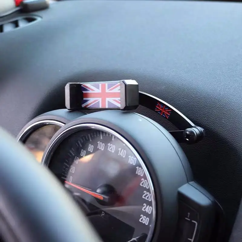 Cell phone mounts are pretty much essential these days because our use of mobile devices is becoming more and more frequent. Most of these cell phone mounts do their best to complement the look of your car interior but still don't quite look integrated. If you want a way to mount your phone in the same style as your MINI Cooper, look no further than the tachometer mounted mobile device holder! This page features the behind tachometer bolt-on Union Jack style cell phone & GPS holder made to fit MINI Coopers The bolt-on mobile device mount fully integrates into your MINI Cooper interior, featuring a monochromatic Union Jack flag design on the phone vice grip. The tachometer extension bracket is made of metal and easily affixes itself on the back of your speed gauge. Screws and a screwdriver is included in your cell phone mount package for convenience. Your UK flag vice grip is flexible so it can be adjusted to any angle or orientation you like, and extends up to 85mm or 3.35 inches to fit many mobile devices. With the MINI Cooper UK style cell phone mount, your smartphone will be easily set by your center console while your vice grip mount will feel integrated into your MINI's interior for a stylish look!