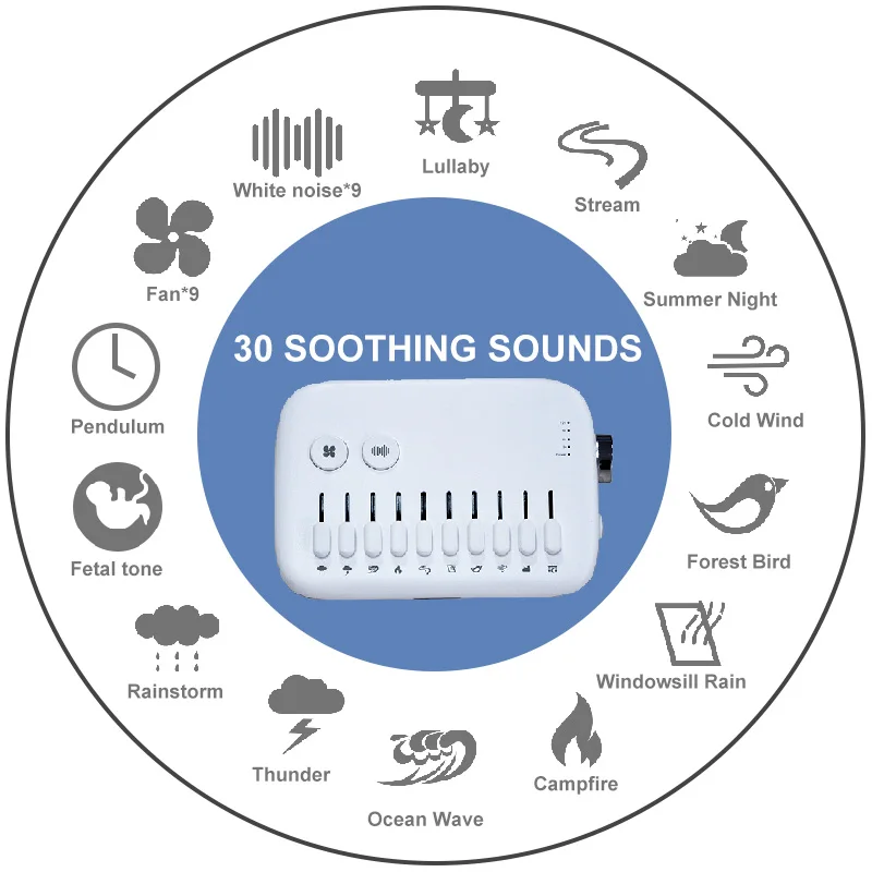 Выберите один из 30 цифровых записанных расслабляющих звуков, они предназначены для имитации естественной среды, чтобы обеспечить наиболее расслабляющий опыт. звук природы поможет убаюкать вашего ребенка, чтобы он уснул, будь то время сна или ночь. В звуках источника, вы можете сделать DIY комбинации на основе вашего воображения,