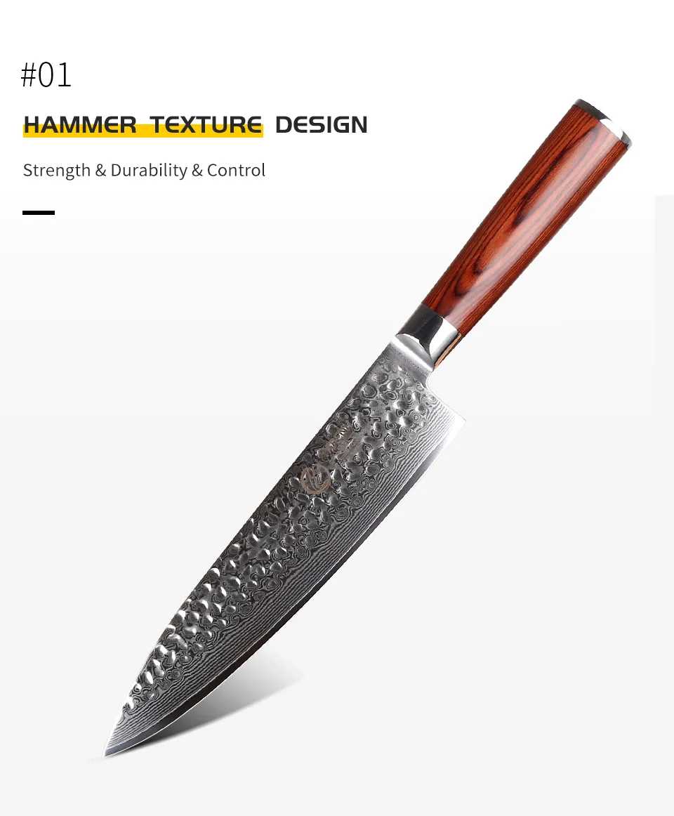 A:The blade material is Japanese Super Steel 67-layer Damascus imported directly from Japan,By using low-cost mature process, it provides customers with the highest quality damascus steel kitchen knife at attractive price, while giving them a sophisticated cutting experience.
