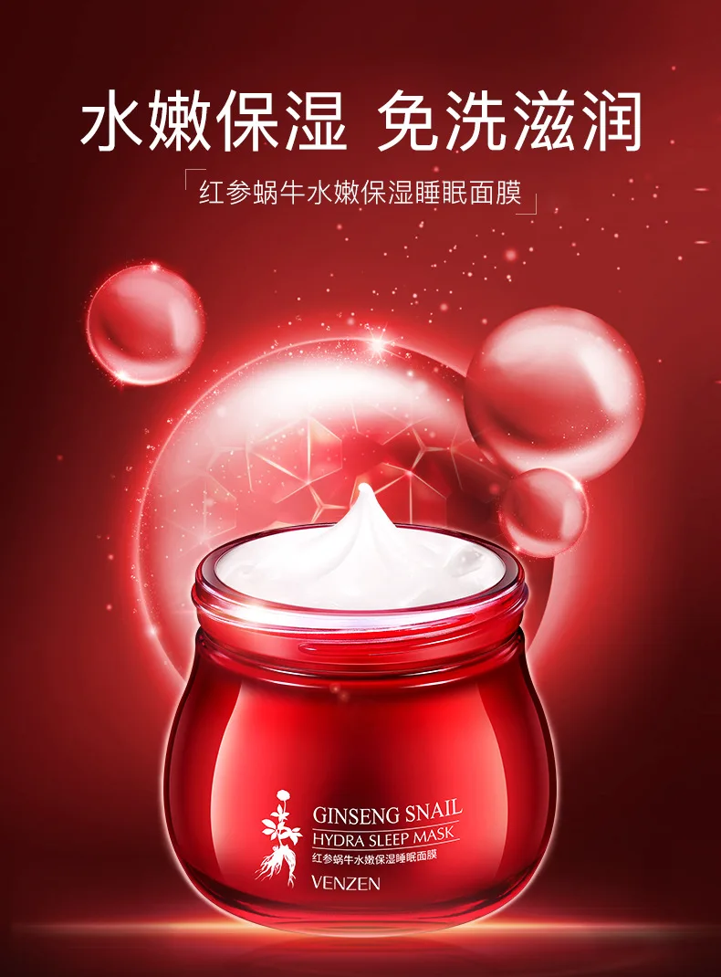 Moisturizing Sleeping Mask Red Ginseng Snail Essence Hydrating Skin Care Refreshing Hyaluronic Acid Anti Aging Face Sleep Mask M Product Name:Sleeping Face Mask Product Specifications: 100G [PRODUCT EFFECT] Helps improve skin dryness and dehydration, creating moisturizing, supple and bright skin. [INGREDIENTS] Snail secretion filtrate, ginseng. [INSTRUCTIONS] 1: Clean the skin and keep it clear and fresh. 2: Take an appropriate amount of this product with your fingers and evenly apply it on the face and neck. 3: Massage gently until absorbed.
