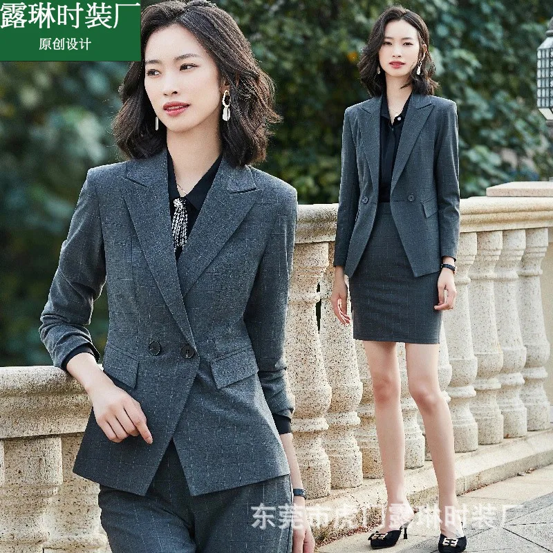 Отзывы о Женский деловой костюм серый пиджак в клетку с длинным рукавом и брюки