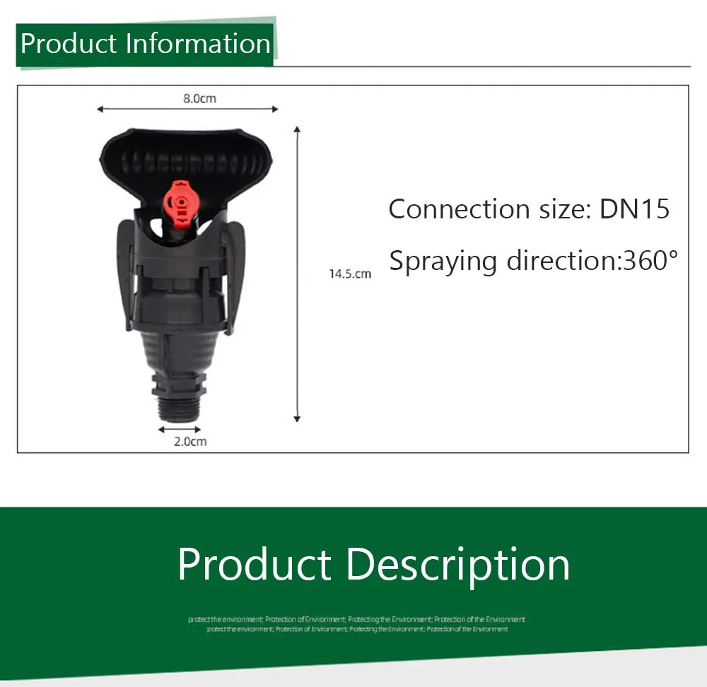 Наименование: DN15 (1/2) пластиковая Вращающаяся насадка Направление распыления: 360 ° Размер соединения: 1/2 '', DN15 Материал: инженерный пластик Расход распыления: 0,5-0,7м³/ч Диаметр распыления: 15-18 метров Характеристики сопла: Этот разбрызгиватель в основном подходит для фермы, пастбищ, плодовых лесов, газонов и других садовых оросителей большой площади. Разбрызгиватель прост в установке и обладает отличными показателями экономии воды