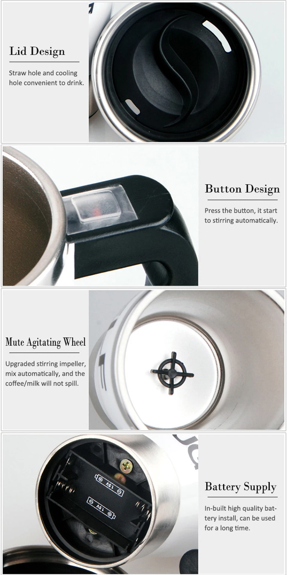 1. Соломенное отверстие с крышкой и охлаждающее отверстие удобно пить. 2. Дизайн кнопки нажмите кнопку, она начнет мешать автоматически. 3. Бесшумное воздушное колесо модернизированное перемешивающее рабочее колесо, смешать автоматически, и кофе/молоко не прольется. 4. Высококачественная Установка батареи, которая используется для длительного использования.