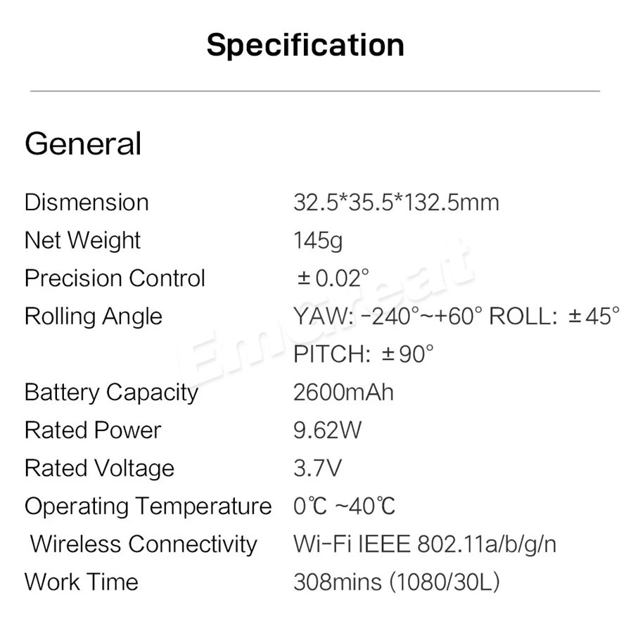Оснащен аккумулятором 2600 мАч, карданный шарнир может работать на 308 мин и даже дольше.