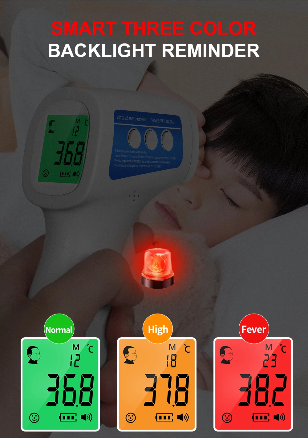 3. Три цвета для информации о температуре: зеленый-нормальный, оранжевый-Легкая температура, красный-высокая температура.