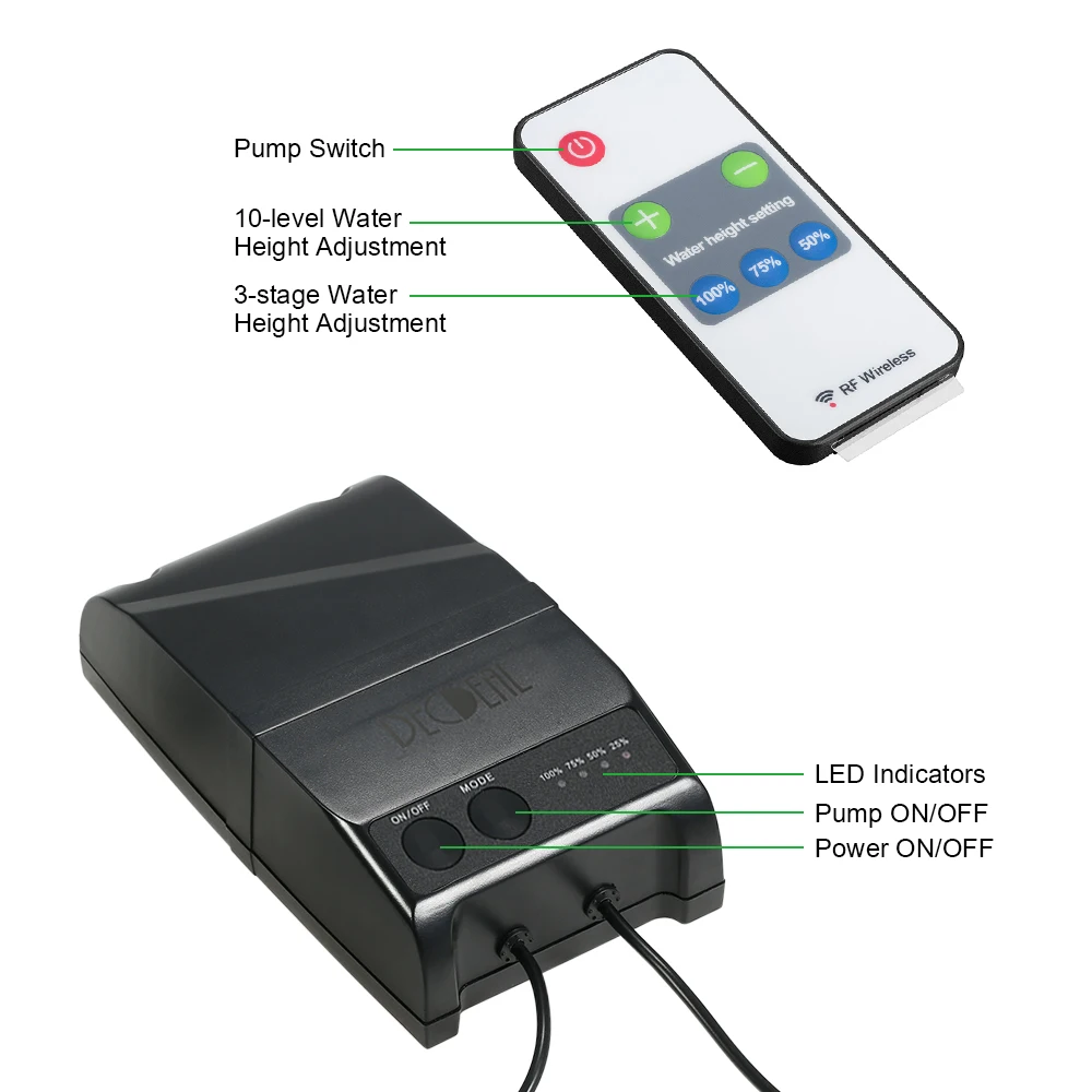 C: пульт дистанционного управления: используется для управления насосом вкл/выкл и регулировки высоты воды