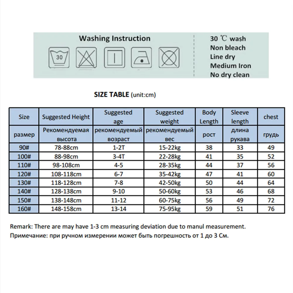 1Inch=2.54CM; 1CM=0.39Inch. Product: Kids Pajamas Long Sleeve Cartoon Children Pajamas For Girls Boys Pyjamas Kids Baby Girl Clothes Suits Boy Sleepwear Nightwear Feature: Fabric: 100% cotton. Washed fabric, soft and comfortable. Dying: Qualified dyestuff, non formaldehyde etc, products passed quality certification. Workmanship: Good workmanship Note: 1.Please kindly refer to your kids actual height and the size chart before purchasing. 2: Due to different producing batches, there may be deviation of 2-3 CM for items. 3: Colors on your computer monitor may differ slightly from actual product colors depending on your monitor settings.