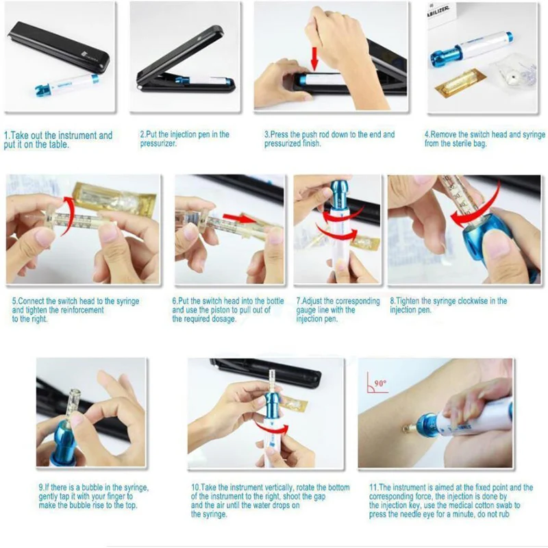 Use non-invasive atomizer Note: 1. If the ampoule is used once, it can not be used anymore because it is a disposable ampoule. 2. White plastic head disinfection before use, if improper use, then the white plastic parts will not turn well, then look at the silver hardware inside the screw there is nothing blocked. 3. Use can not be always hair, but to follow the steps to do, if ever hair, it may lead to gun fever quickly and it will automatically protect the protection after the fight, to wait for it to reach the normal use temperature Can be used under. 4 use 30 minutes, wait 5 minutes to cool, then use, if the heat can not lead to that, it is all right, so it can be cooled 2 to 3 minutes to normal use, this is normal, but also can not say that gun problem. Non-invasive nebulizer therapy Note: 1. Do not squeeze the injection site after injection for different physical groups, the performance after injection will be different. The main phenomenon is the presence of red spots or small blood drops in the injection site, these are normal, the normal recovery period of 1 week, some differences in physical fitness for 2 weeks. 2. 2 days after use do not make-up, pay attention to sunscreen, do not soak in hot springs, less exercise, apply more mask. 3. The initial operation or the site of the wound is forbidden to use; People with many teeth in the teeth are forbidden to use; Those who are very weak in sebum membrane are hard to fade red when they touch the skin, and those who are allergic to leukemia can not use it. 4. Face surgery, and deep exfoliation did not recover the crowd can not do; people receiving radiotherapy can not do; 5. After doing care do not use their own ointment, skin care products or cosmetics to clean the treatment area, and do not touch the treatment area to reduce the risk of infection. Use: 1. Take the instrument and put it on the table. 2. Place the injection pen in the pressure regulator. 3. Push the push rod to the end and pressurize finish. 4. Remove the switch head and spray from the sterile bag. 5. Close the switch head to the syringe and turn the gain to the right. 6. Put the switch head in the bottle and use the piston to pull the required Dosage. 7. Adjust the corresponding gauge line with the injection pen. 8. Turn the syringe clock into the injection pen. 9. If there is a bubble in the syringe, gently tap it with your finger to the bubble Ascend to the top. 10. Take the instrument vertically, turn the bottom of the instrument to the right, Shoot the gap and the air until the water drops on the syringe. 11. The instrument is aimed at the fixed point and the corresponding force, the Injection is done by the injection key, use the medical cotton swab to put on the needle Eye for a minute, don't rub.
