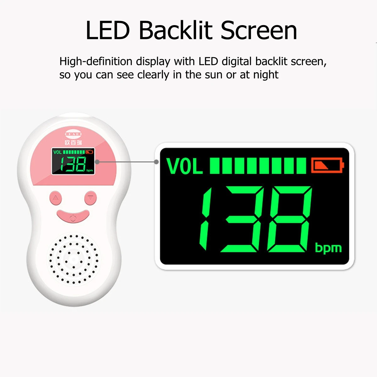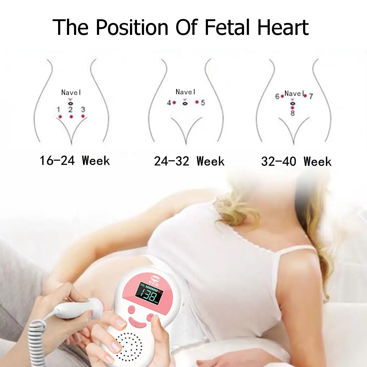 Как использовать: 1. Прежде чем использовать его в первый раз, убедитесь, что 2 * батарейки AA находятся в 2. Нажмите кнопку питания для включения, затем отрегулируйте громкость 3. Лежите на плоской подошве с подушкой, держите ноги ровными и расслабляйтесь 4. Прикрепите фетальный зонд к животу, чтобы определить положение плода и определить наилучшее направление к сердцу плода 5. После того, как вы услышите обычный звук сердца плода, значение FHR будет отображаться на экране в режиме реального времени