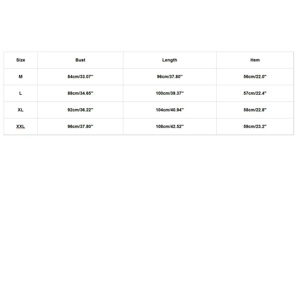 Размер: M Обхват груди: 84 см/33,07 дюйма Длина: 96 см/37,80 дюйма подол: 56 см/22,0 дюйма Размер: L Обхват груди: 88 см/34,65 дюйма Длина: 100 см/39,37 дюйма подол: 57 см/22,4 дюйма Размер: XL Обхват груди: 92 см/36,22 дюйма Длина: 104 см/40,94 дюйма подол: 58 см/22,8 дюйма Размер: XXL Обхват груди: 96 см/37,80 дюйма Длина: 108 см/42,52 дюйма подол: 59 см/23,2 дюйма