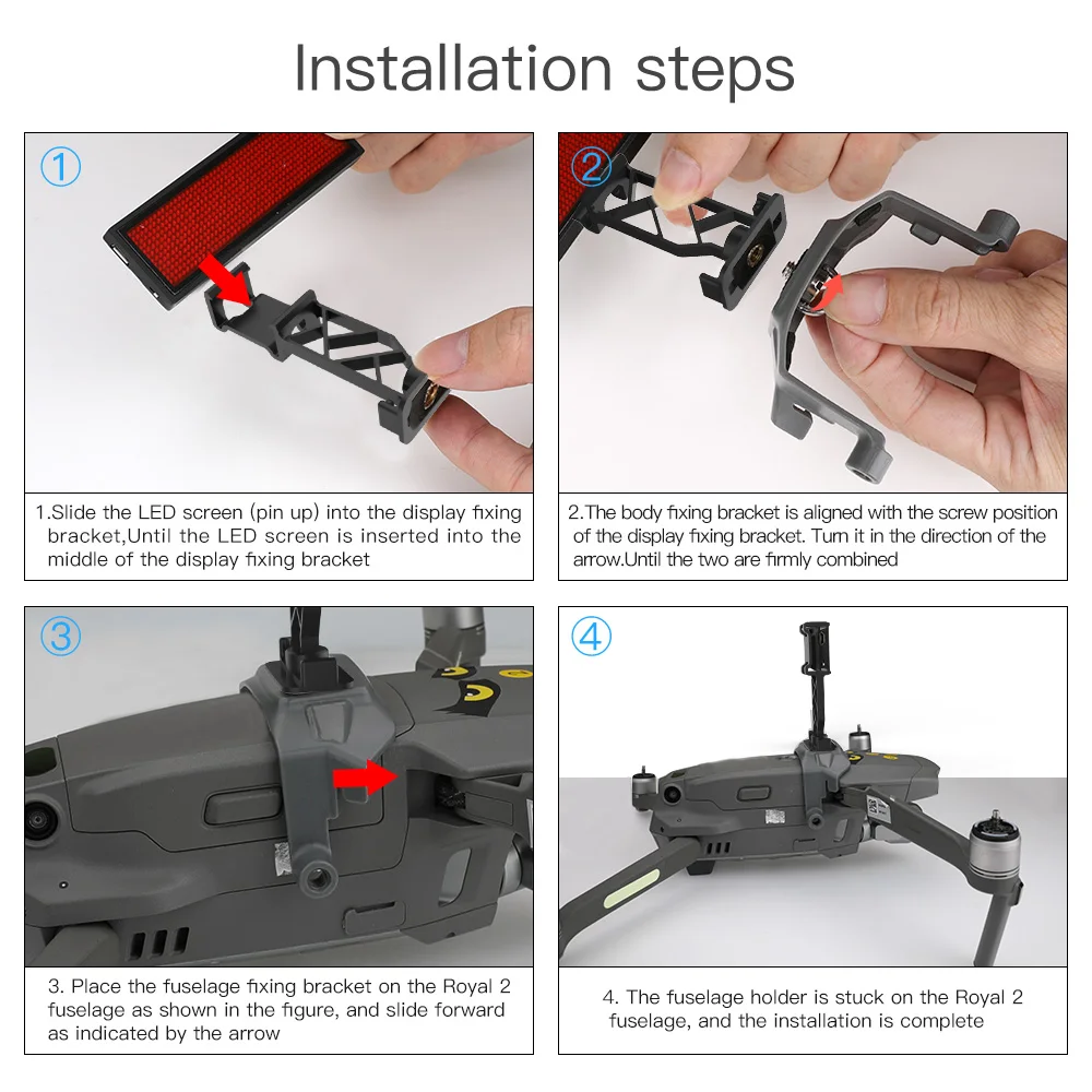 Особенности: 1. Поддержка нескольких языков и узоров. 2. Может отображаться до 160 английских символов. 3, легкий дизайн, общий вес 58 г 4. Режим отображения: отображение немедленно, перемещение влево, вправо, вверх, вниз, мигание Параметры: Материал: АБС-пластик и Резина Яркость: Регулировка яркости в приложении Режим отображения: перемещение вверх/вниз/влево/вправо/вспышка Емкость аккумулятора: 250 мАч Напряжение: AC110V-220V Время зарядки: 3-5 часов Время работы: 6-10 часов Расстояние управления Bluetooth: до 15 м в открытом пространстве Вес нетто: 58 г Размеры: 9,3x3,4x13,6 см Подходит для: DJI Mavic 2 Pro Drone и DJI Mavic 2 Zoom Drone Посылка список: 1 x светодиодный Экран 1 x фиксированный кронштейн дисплея Зарядный кабель-1 шт.; 1 х фиксированный кронштейн Примечание: Дрон и другие аксессуары не включены