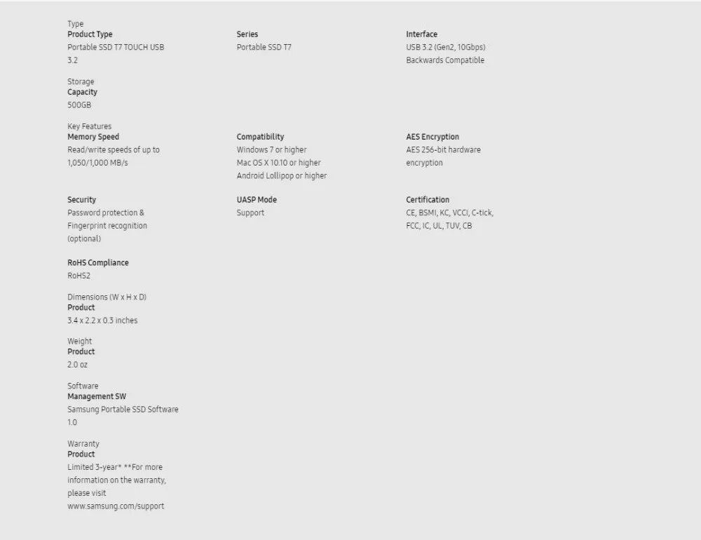 *Compatibility with host devices may vary. Some operating systems may require T7 Touch reformatting. Please find the compatible devices list on www.samsung.com/support.**T7 Touch is compatible with USB 3.0 and USB 2.0.
