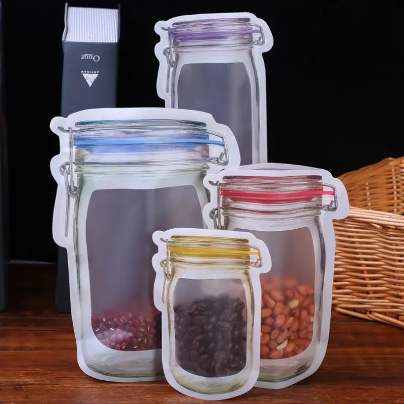 Сумки на молнии для хранения еды с модным дизайном в форме банки Мейсона, чтобы быть вашим идеальным компаньоном для путешествий и кемпинга, которые идеально подходят для защиты свежести разнообразных закусок, фруктов, овощей, крекеров, печенье и сэндвич, и т. Д., которые подходят для транспортировки.