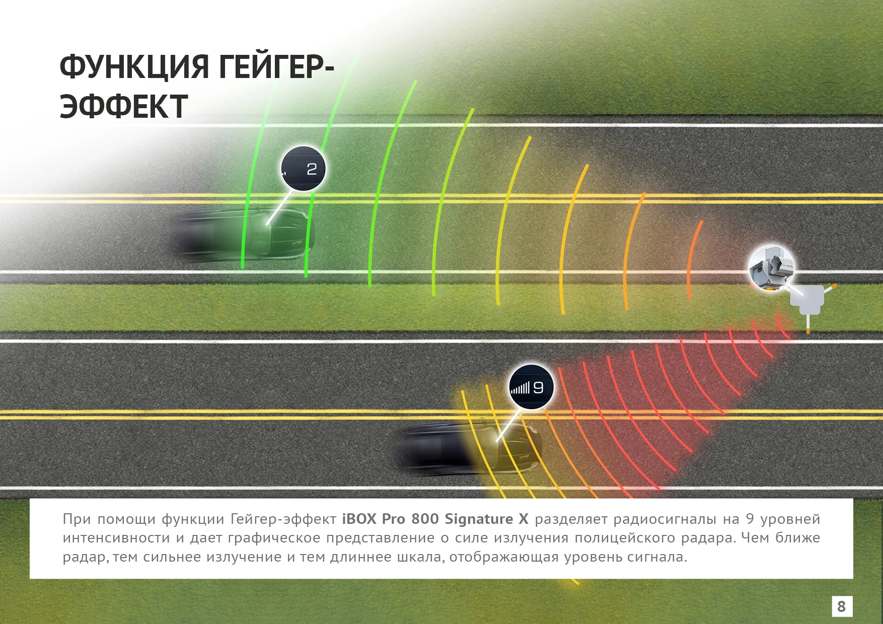 Функция Гейгер-эффект (9 уровней) дает графическое представление о силе излучения полицейского радара. Чем ближе радар, тем сильнее излучение и тем длиннее шкала, отображающая уровень сигнала.