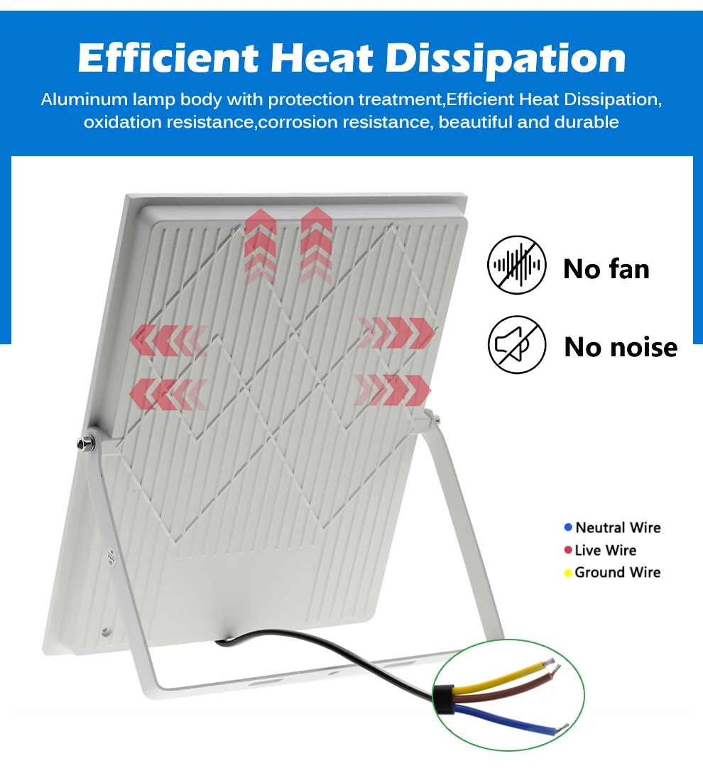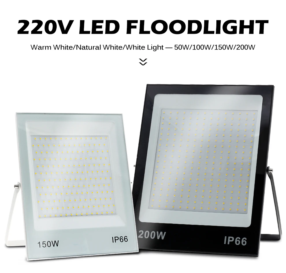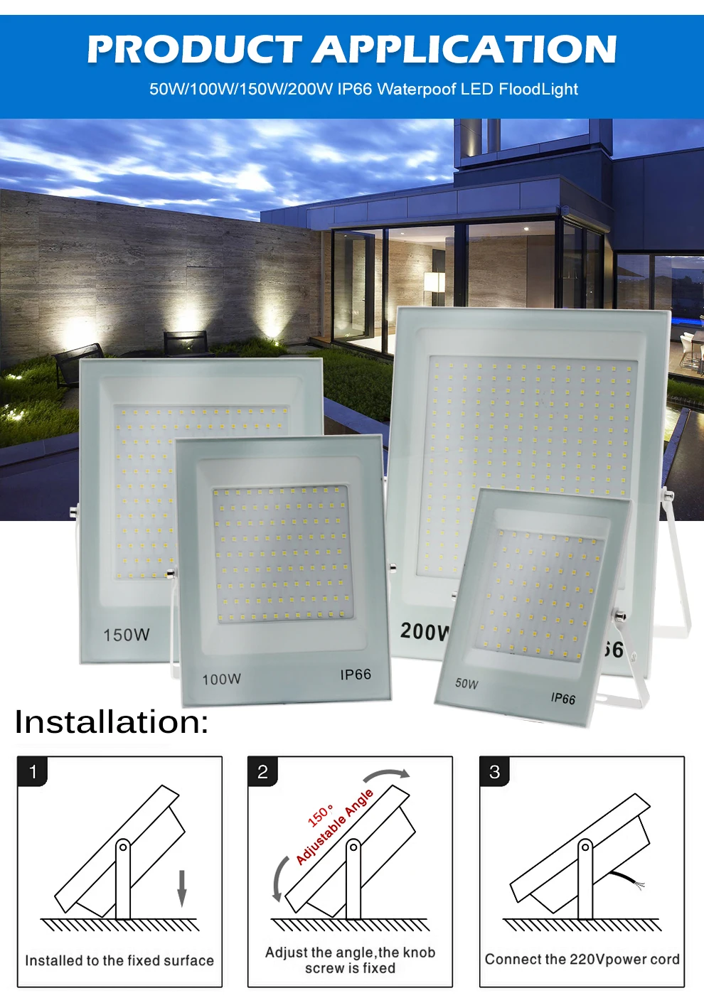 LED Sportlight 220V 50W 100W 150W 200W Ultral Thin Outdoor Floodlight IP66 Waterproof for Garden Yard Street Specification:Wattage: 50W/100W/150W/200WInput Voltage: AC220VShell color: Black/ WhiteLight Color: White(6000k) /Natural(4000k) /Warm white(3000k)Lumen: (50W)4500LM/ (100W)9000LM/ (150W)13500LM/ (200W)18000LMLed Chip Quantity: 64/108/180/252PcsIs Plug Included: NoWaterproof Level: IP66Material: ABS+Aluminumillumination angle (degrees): 180 degreeSize: 50W: 170*130*12mm100W: 205*160*14mm150W: 250*198*17mm200W: 290*230*18mm Application:The outside flood light can work well in rain, sleet, snow.Our Led Floodlight suitable for both indoor and outdoor, can be applied in gardens, factories, stadiums and other places. Warm Tips1. It is not a solar light /the light has no motion sensor /no timer /no dawn to dusk function.2. Please do not submerge the light under the water.3. This lamp does not include a plug.