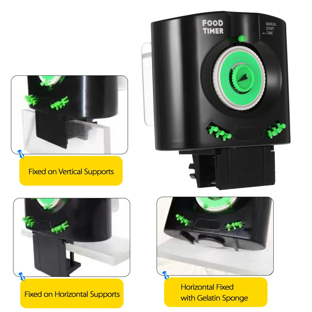 Простой Разработанный таймер для рыбной еды очень прост в настройке. С индексом 24 часа и секундной стрелкой циферблат поворачивается по мере того, как идет день. Есть шесть контактов с питателем и установить время кормления, просто поместите зеленый зажим на время, которое вы хотите кормить. Это Автоматический фидер рыбы, но вы также можете повернуть циферблат вручную для подачи в настоящее время. Действительно удобный беззаботный способ накормить свою рыбу, пока вы находитесь вдали.
