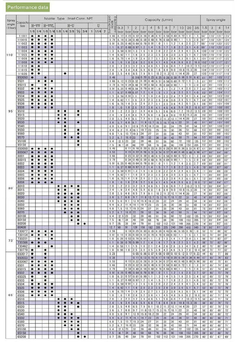 It is available in a wide range of spray angle from 15 to 110 degree measured at 3 bar,the spray angle generally increase with pressure, as shown the performance table.