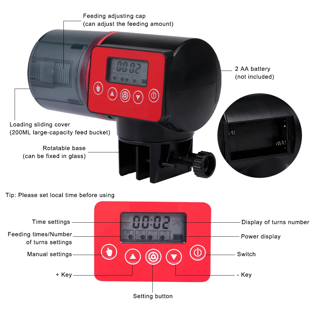 После фиксации фидера его можно повернуть в нужное вам положение. Этот Автоматический фидер позволяет установить время подачи, в то же время, вы также можете кормить вручную и испытать удовольствие от кормления.