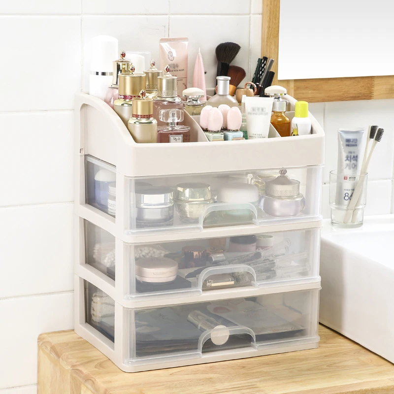 Продукт представляет собой сочетание прозрачного пластика и белой пластиковой рамы, подходящей для рабочего стола спальни, чтобы принять косметику, ювелирные изделия и другие мелкие аксессуары, а также продукты для ванны.
