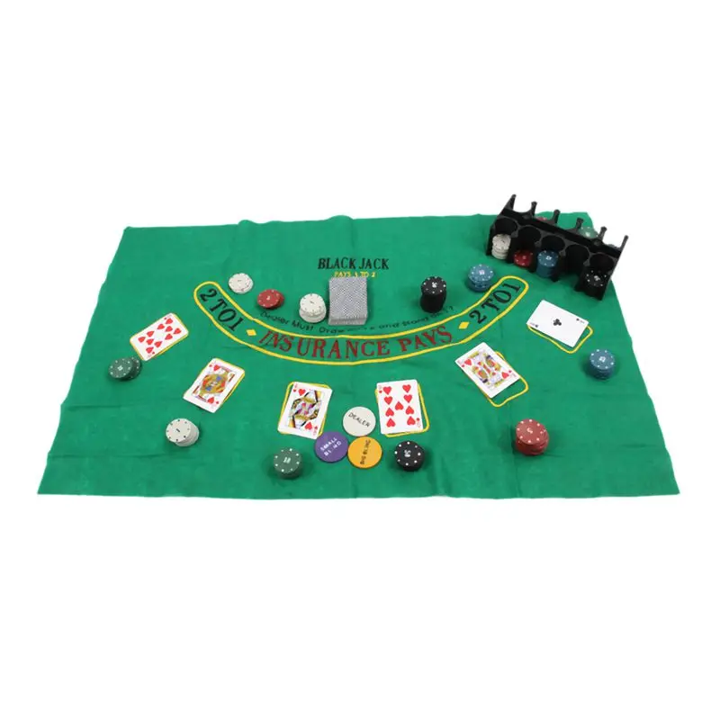 Including: 200 Poker Chips Set + 1 poker baccarat table cloth + 2 Decks of playing cards + 3 Pieces of special chips + 1 Tin box + 1 Chips rack