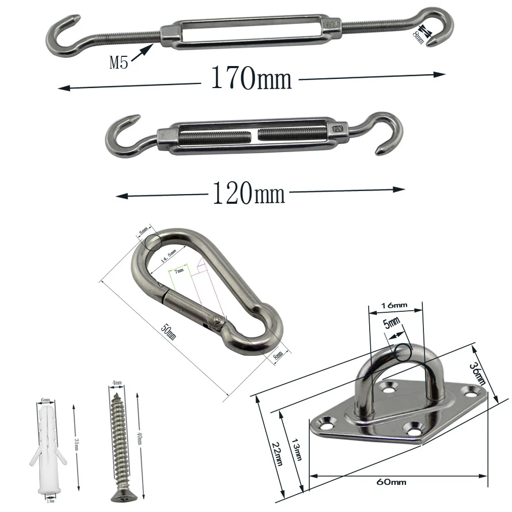 Использование:Этот товар представляет собой набор подходящих комплектов для навесного паруса. M5 ромбовидная Накладка для глаз используется для создания точки крепления на здании или дереве. Используется вертушка M6 OC Для натяжения веревки. Крючок M5 используется для прикрепления угла паруса к точке крепления. Самонарезающий винт используется для фиксации накладки на здание или Дерево.
