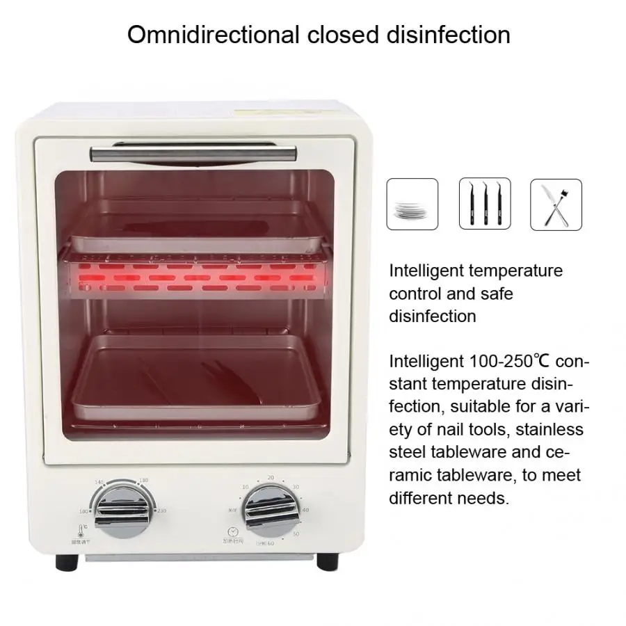1. Полная 360 ° Закрытая дезинфекция, 230 ℃ цикл высокой температуры стерилизации, устраняет 99% бактерий. 2. Интеллектуальная 100-250 ℃ постоянная температурная дезинфекция, подходит для различных инструментов для ногтей, посуды из нержавеющей стали и керамической посуды. 3. Три инфракрасных кварцевых нагревательных трубки, 5 секунд быстрого нагрева, 250 ℃ высокой температуры стерилизации сушки влаги, препятствует росту плесени. 4. 2 лотка и 12 л большой емкости, более удобный в использовании. 5. 30 минут интеллектуального времени, время автоматически выключается, и время может быть легко контролируется. 6. Нескользящая ручка, нескользящая основа и рассеивание тепла.