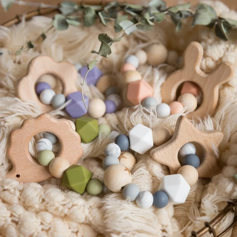 1 шт. силиконовый Прорезыватель для зубов из бусин браслет из деревянных бусин Прорезыватель зубов для кормления игрушки, не содержащие БИСФЕНОЛ Буковый деревянный браслет со звездами Сделай Сам детский Прорезыватель