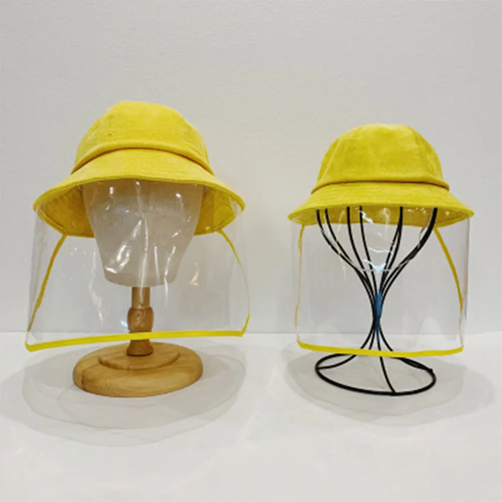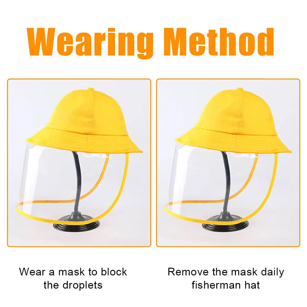 Защита лица может быть обеспечена путем ношения защитного колпачка и маски для предотвращения распространения капель во всех направлениях. Маску можно протереть дезинфицирующим средством и повторно использовать для защиты детей во всех направлениях. После вспышки, передняя маска может быть удалена, чтобы стать обычной шляпой дикого рыбака.