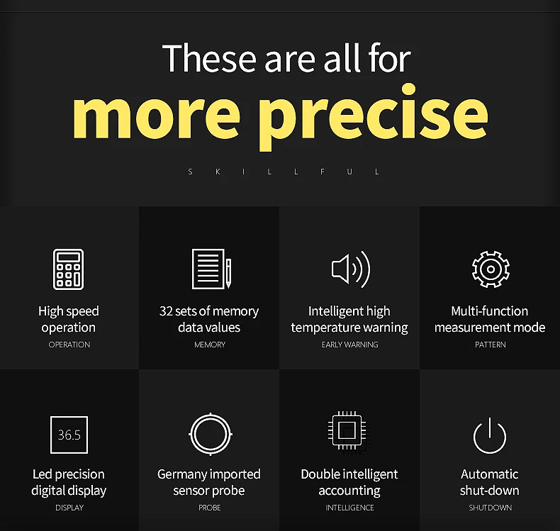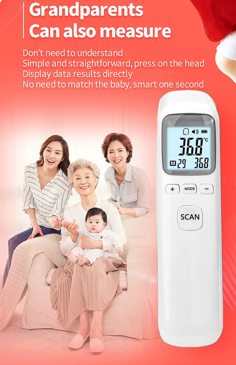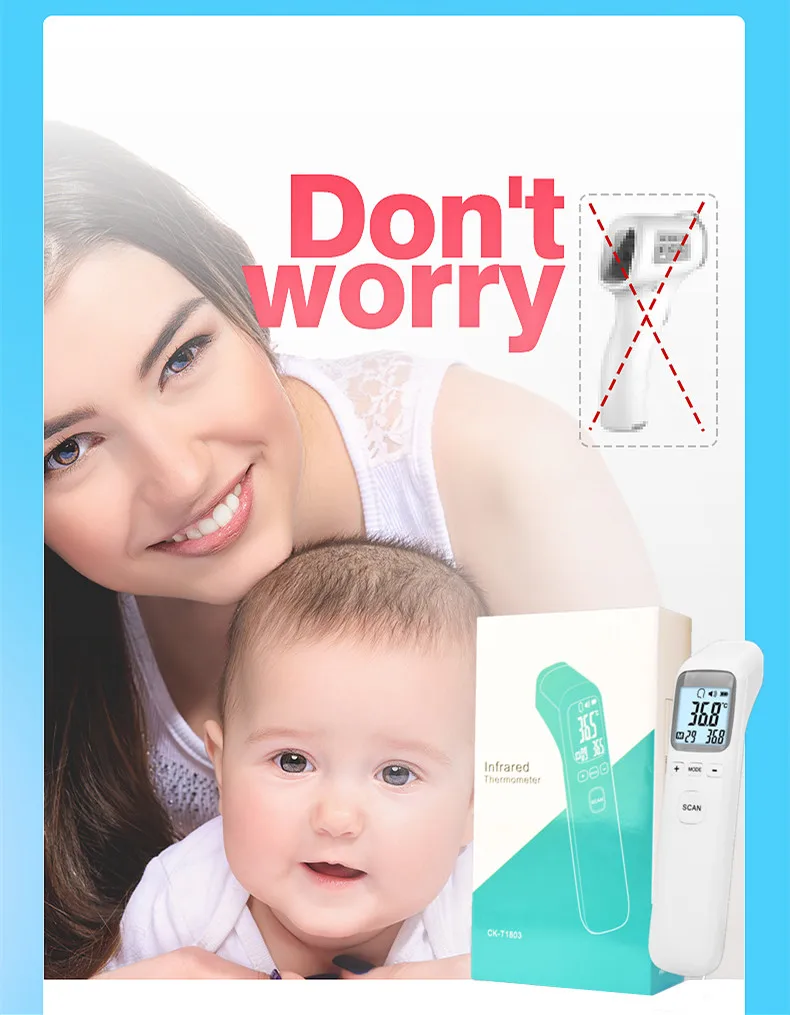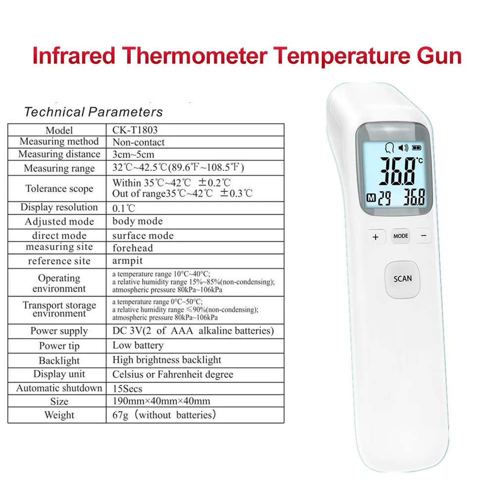 Особенности термометра: 1. Германия прецизионные зонды Точность: ± 0,1 ℃. 2. Всего за 1 секунду можно измерить температуру тела. 3. ЖК-дисплей 4. Две модели: модель тела (температура тела); Модель объекта (вода, молоко, пищевая температура и так далее). 5. Избегайте касания кожи, удобно измеряйте температуру ребенка. 6. Хранение 32 заданных значений. 7. Автоматическое выключение 15 секунд. Применение шаги: Шаг 1: положите в батарею (советы: Не устанавливайте неправильно). Шаг 2: от лба 1-3 см, они нажимают клавишу meassurment, экран покажет температуру тела. Шаг 3: кнопка «режим» может переключить температуру тела и температуру объекта. Примечания: * когда вы устанавливаете батарею, убедитесь, что знак "+/-" * Аккумулятор не будет включен, из-за того, что он не может быть отправлен, пожалуйста, обратите на это внимание!