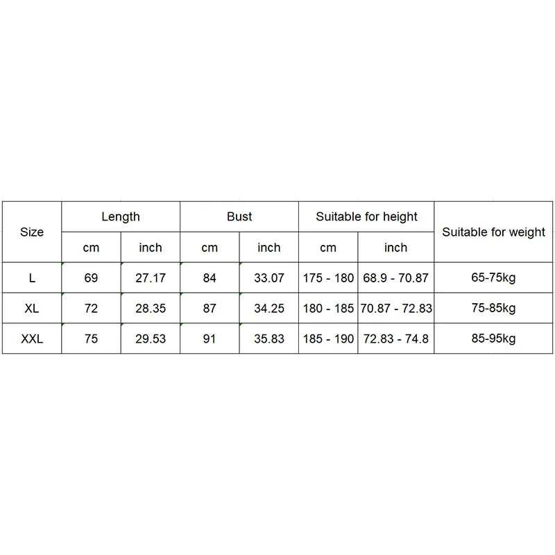XL ,(см/дюйм), длина: 72/28,35, Бюст: 87/34,25 подходит для роста: 180 - 185/70,87-72,83, подходит для веса: 75-85 кг