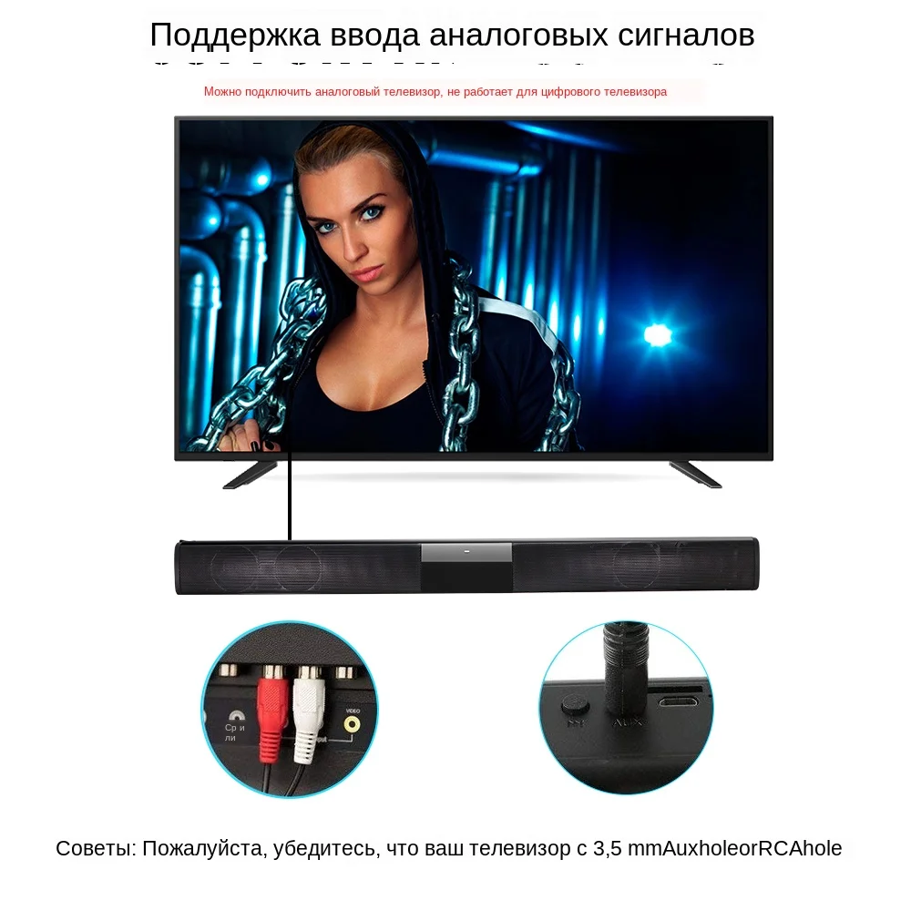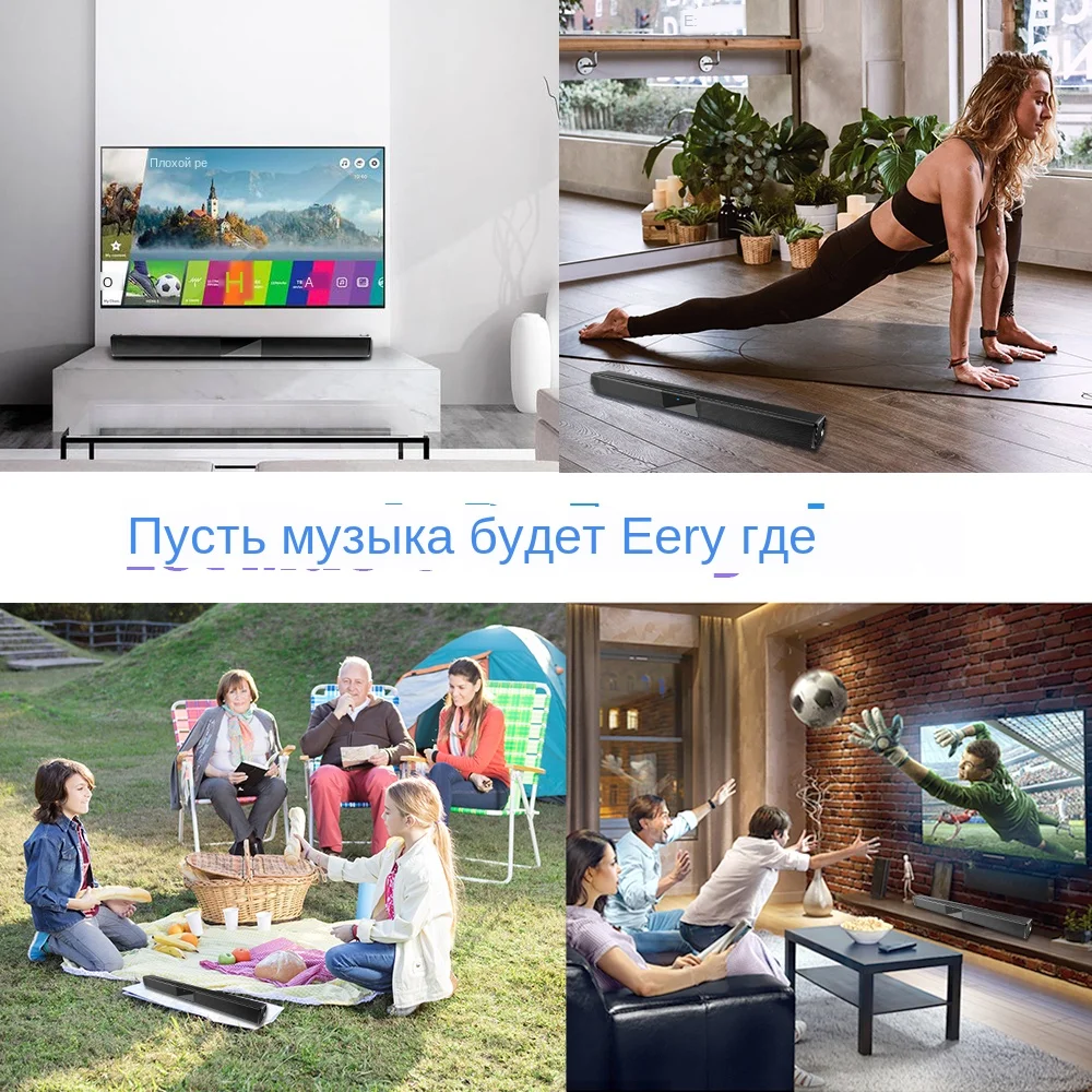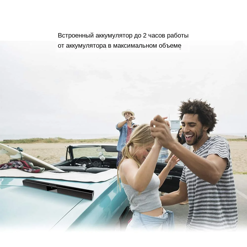 22 дюйма Длина звуковая панель с реверсивным звуковым со встроенной батареи, которая может воспроизводить музыку до 2 часов в максимальной громкости костюмы для внутреннего и наружного использования. Подключите звуковую панель к телевизору с помощью одного из прилагаемых кабелей.