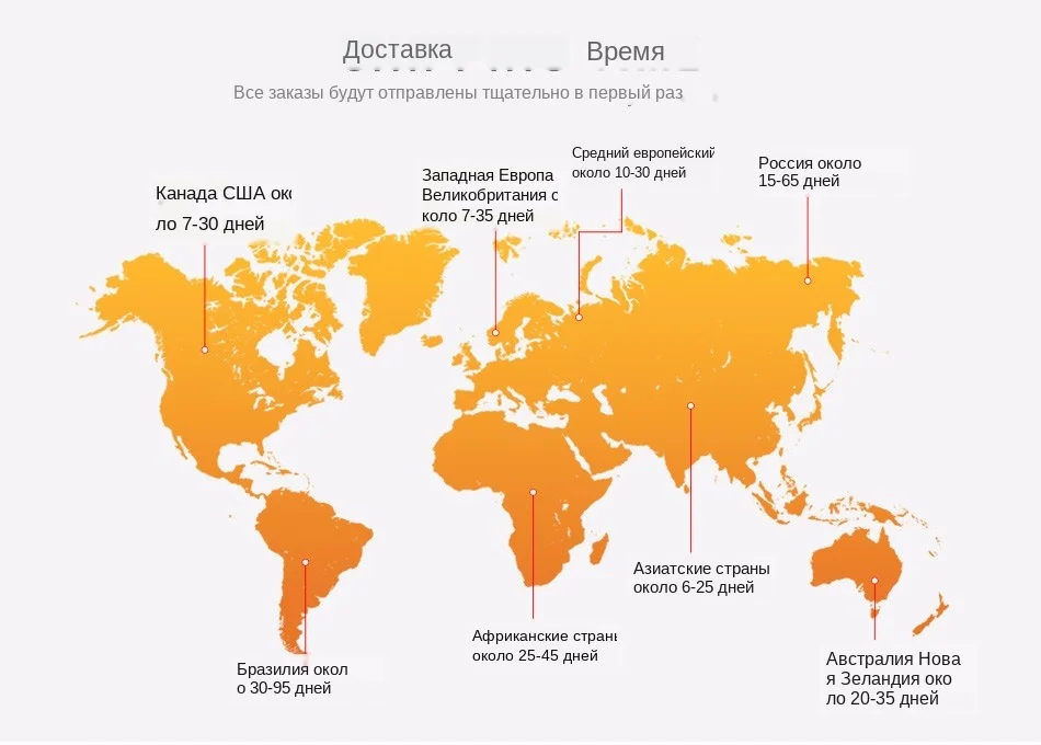 A. Доставка и обработка Мы будем принимать различные каналы в соответствии с характеристиками транспортировки товаров. Он может достигать более чем 200 стран и регионов. Из-за различных каналов, время отображения информации отслеживания не одинаковое. Как правило, почтовые посылки 1-4 дня, Международный курьер 1-2 дня. Время отслеживания будет продлено. B. О таможенных сборах и тарифах Почтовая посылка, как правило, не производит пошлины, но из-за таможенных правил разных стран, время таможенного оформления имеет разницу, пожалуйста, своевременно отслеживая информацию, свяжитесь с вашим местным почтовым отделением, если это необходимо. Международный курьер обычно производит пошлины, пожалуйста, поймите местные таможенные стандарты, чтобы избежать таможенных проблем, привести продукт к возврату или уничтожению, если это необходимо, пожалуйста, проконсультируйтесь с вашей местной компанией по таможенному оформлению или несите информацию в местное таможенное оформление.