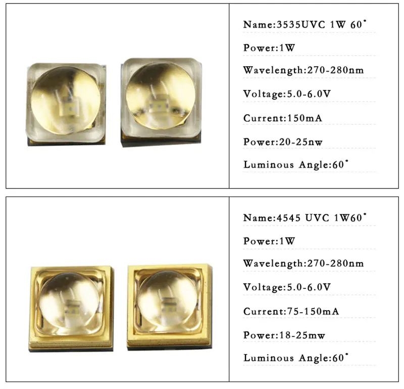 4545UVC 1 Вт: один кристалл, Кварцевая посылка, разбавленная алюминиевая подложка, японская посылка DOWA chip, полоса 270nm-280nm