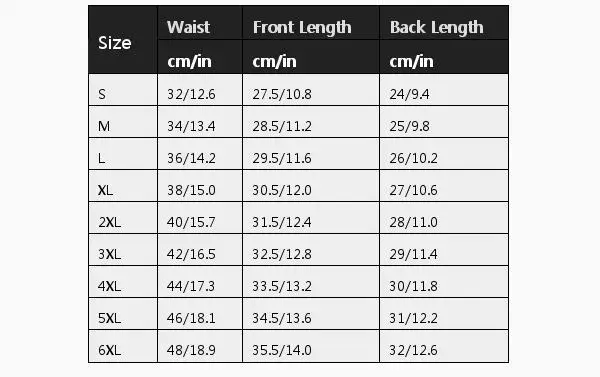 Размер; Обхват талии; Длина спереди; Длина сзади