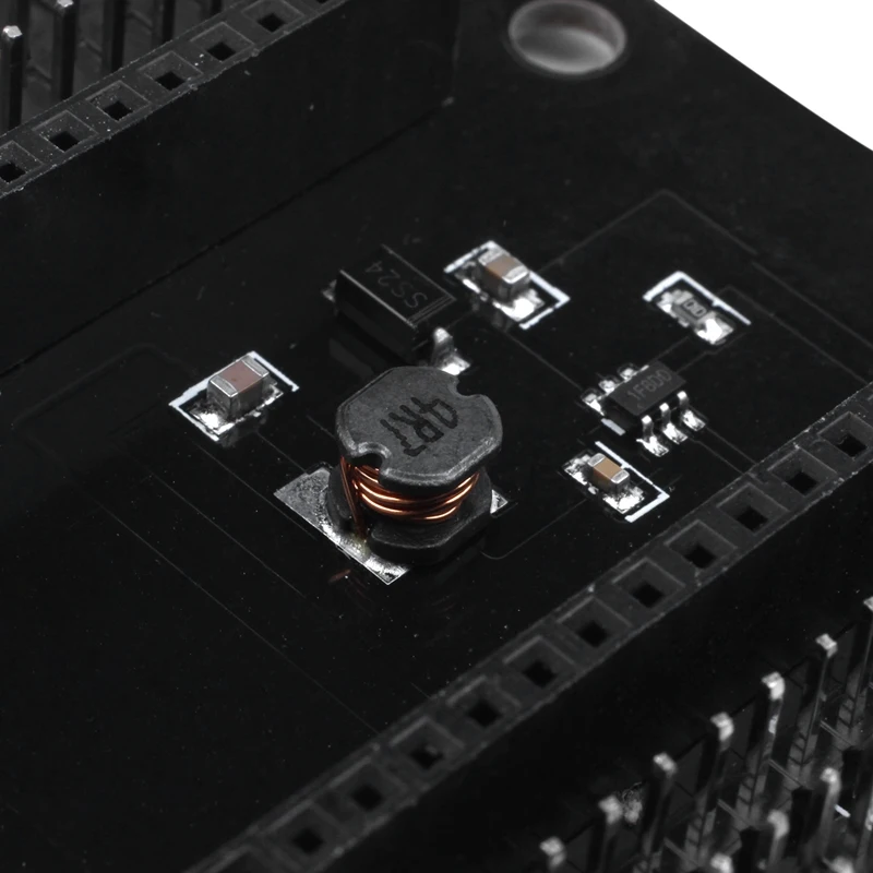 This baseboard is fitted with an onboard switching DC-DC buck (wide input range) and a standard 5.5 x 2.1 mm DC socket, mounting holes and numerous headers are available to esase NodeMCU V3 module usage