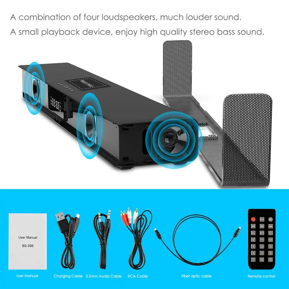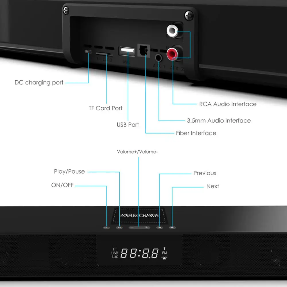 There are discrepancies between the size of the product and the image of the product. Please understand the specific size before purchase. 1 Upgraded version of the deluxe audio, 4 speakers, 3D stereo surround sound, the effect is absolutely shocking. 2 Support Bluetooth connection, fully compatible with most kinds of Bluetooth devices, wireless playing, do follow your heart. 3 Support U disk playback.You can also play the audio of your phone or other device via the audio cable. 4 Built-in DSP sound processor with clear sound and no noise. 5 Simple connection, easy to operate. 6 Watching TV at home is like watching a movie at a movie theater. It gives you a theater level sound experience. Product features and parameters: 1. Bluetooth version: V4.2+BR+EDR+BLE 2. Transmission distance: 8-10 meters 3. Music playback time: maximum volume is about 3.5h, medium volume is 7h 4.IA charging time: about 5 hours 5. Use QI charging separately: charge the phone with 3000MAH 6.QI charging + speaker playback time: can charge the phone 1500MAH+1.5h playing time 7. Standby time: 120h 8. Support file format: MP3, WAV, WMA, FLAC, APE 9. Battery material: 18650 10. Battery: 4000MAH 11. Charging voltage: DC 5V/1A-2A 12. Charging socket: micro 5pin (V8) 13. Speaker power: 5W*4 14. Input source type / function: Bluetooth / TF card / U disk / 3.5MM / RCA / fiber / infrared remote control / alarm clock / wireless charging 15 product size: 561*102*57mm 16. Bare weight: 1511g 17. Box packaging weight: 1690g 18. Single box size: 59*14*8.5cm 19. Accessories include: 3.5 audio cable, charging cable, fiber optic cable, RCA cable, remote control, manual Only the above package content, other products are not included. Note: Light shooting and different displays may cause the color of the item in the picture a little different from the real thing. The measurement allowed error is +/- 1-3cm. Package Contents: 1 x Speaker 1 x Charging Cable 1 x 3.5mm Audio Cable 1 x RCA Cable 1 x fiber optic cable 1 x remote control1 x User Manual