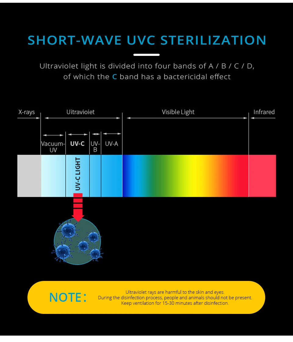 Примечание: UVC лучи вредны для глаз и кожи, поэтому, когда лампа включена, не смотрите непосредственно на лампу. Когда свет работает, люди/Домашние животные/растения должны выйти из комнаты.