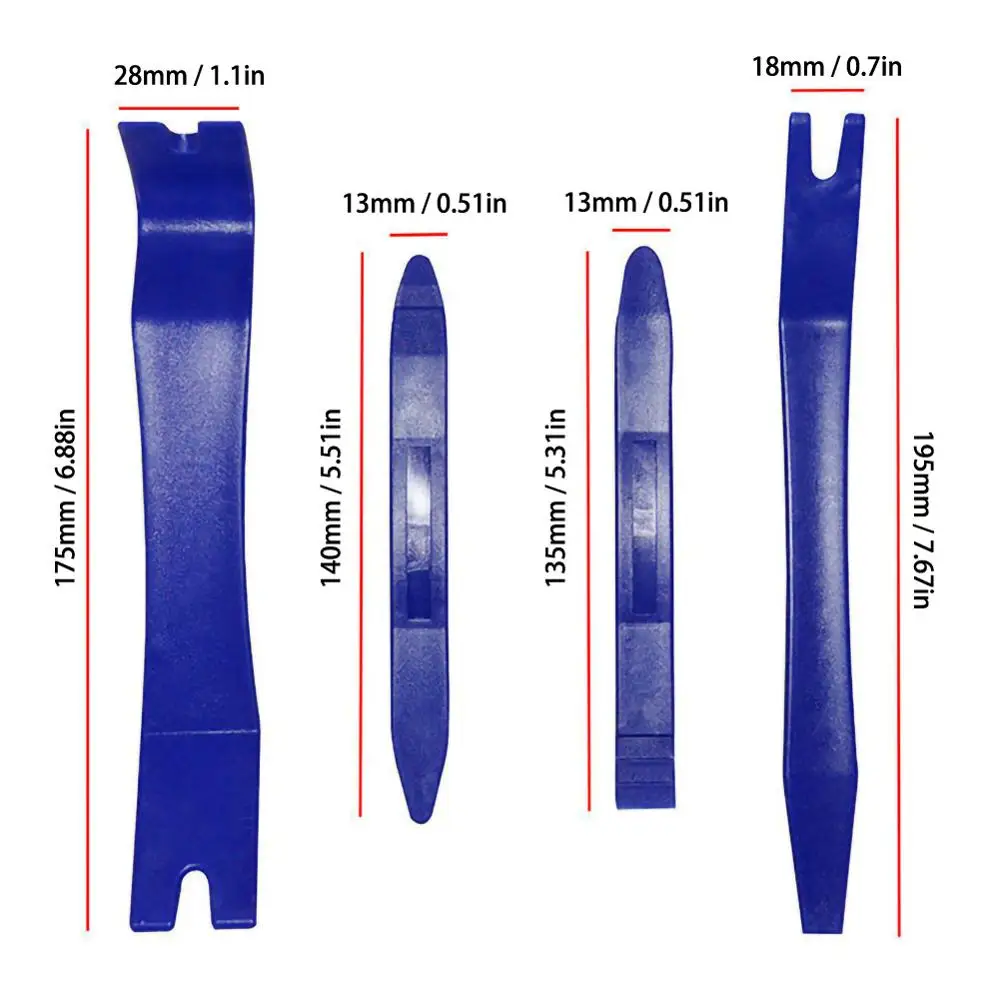 Особенности: * Легко и безопасно удалять радиопанели, обрезку, формование, дверные панели и панели приборов. * Отлично подходит для автомобильной оснастки на отделочной панели и удаления литья. * Уменьшите вогнутые и выступающие шрамы, оставленные с помощью винтового ножа или других неэффективных инструментов. * Высококачественный прочный дизайн, изготовленный из прочного пластика.* Работа над внутренней и внешней отделкой, удалением широкого края, устройство для удаления рукоятки или обивки зажима. Описание: 100% новый и высокое качество Материал: пластик Цвет: синий Размер: как показано на картинке (1 мм = 0,0394 дюйма) Количество: 7 шт./компл. Посылка включает в себя 7 * Автомобильное снятие магнитолы инструменты Без розничной коробки. Безопасно упаковывается в пузырчатую сумку.